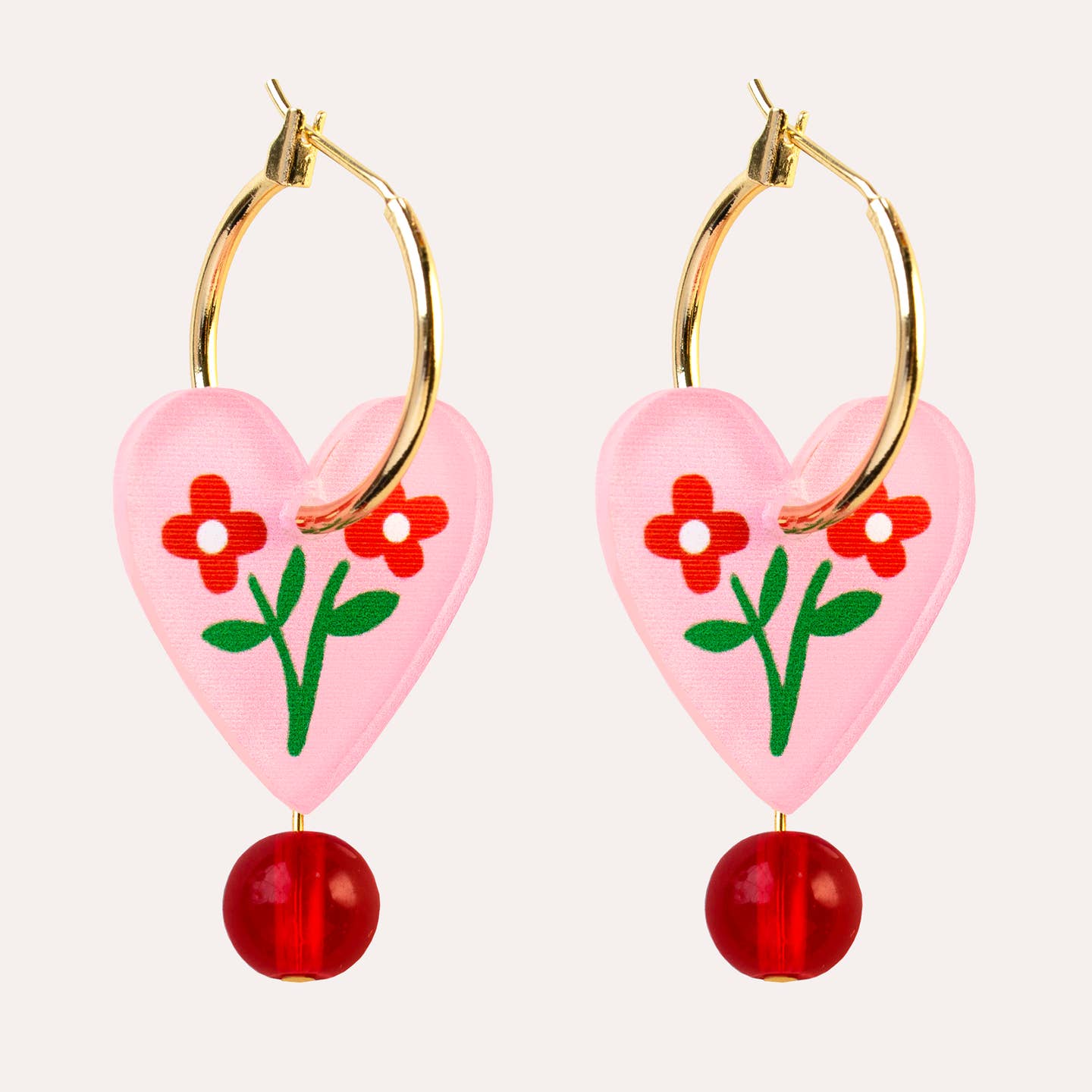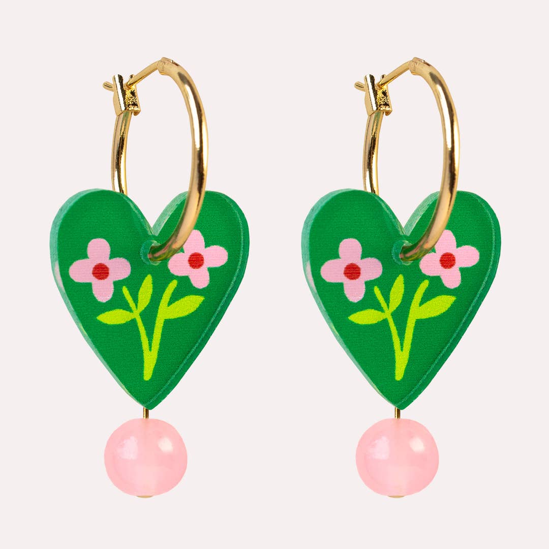 Add a joyful pop of colour to everyday outfits with these floral charm hoop earrings, featuring an illustrated floral heart charm finished with a sweet glass bead that gently sways as you move. these illustrated earrings have playful movement and a bright, eye-catching feel that instantly elevates daily style.