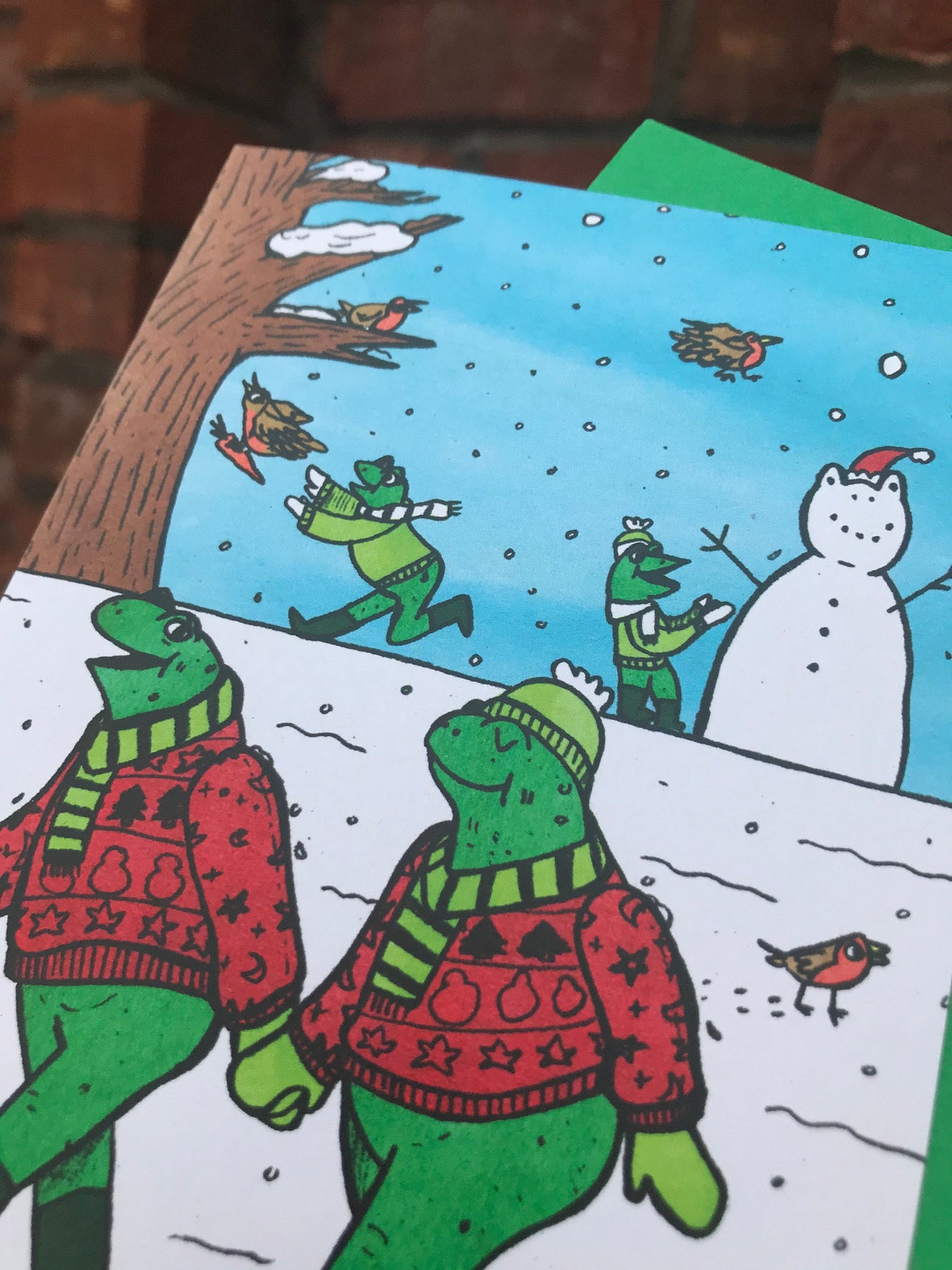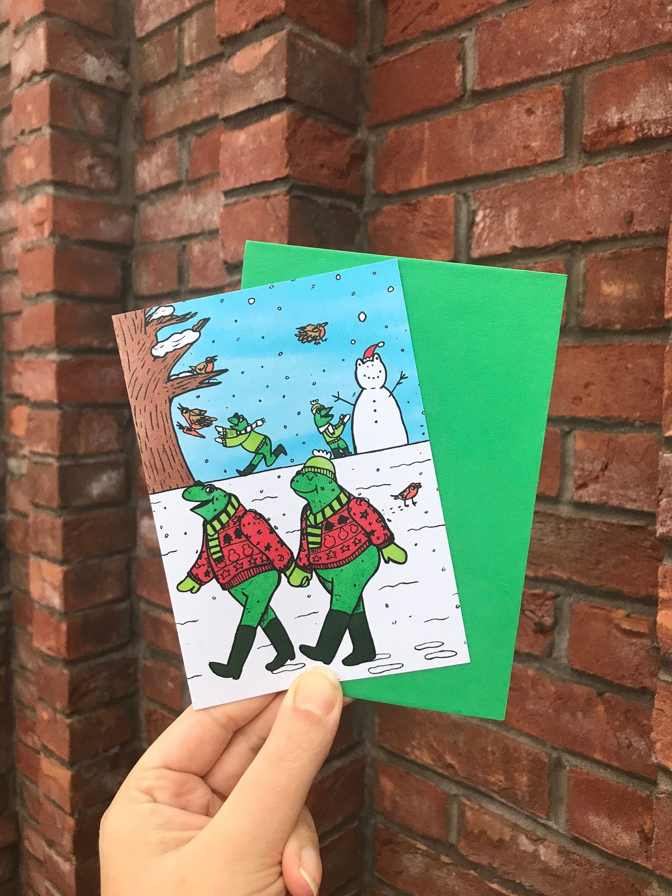 This gorgeous scene was originally hand drawn and coloured in with inks, reproduced in vibrant print on a A6 card. It's the most wonderful time of the year, even for frogs.