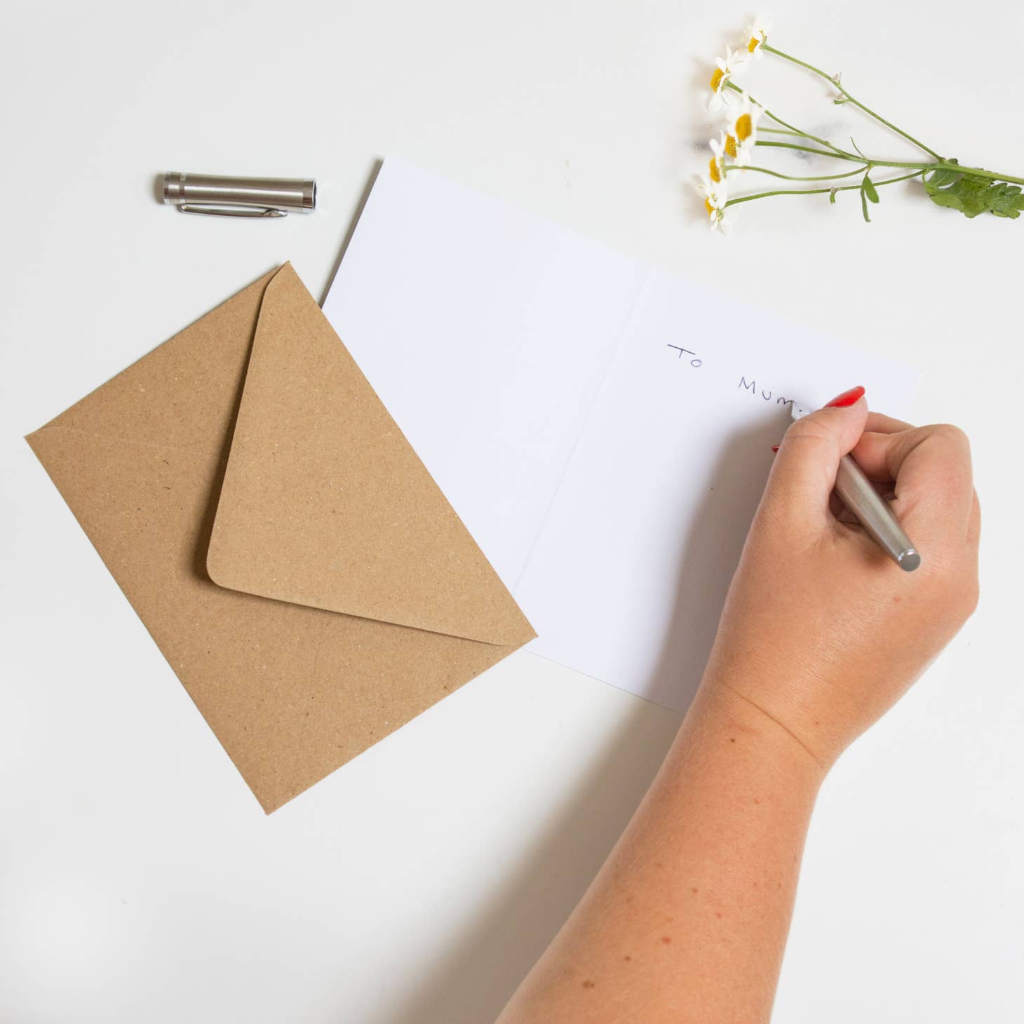 Printed on A6 recycled white card. Includes a recycled flecked brown kraft envelope. Wooden shapes are made in the UK from sustainable birch wood. Blank inside for your own message.