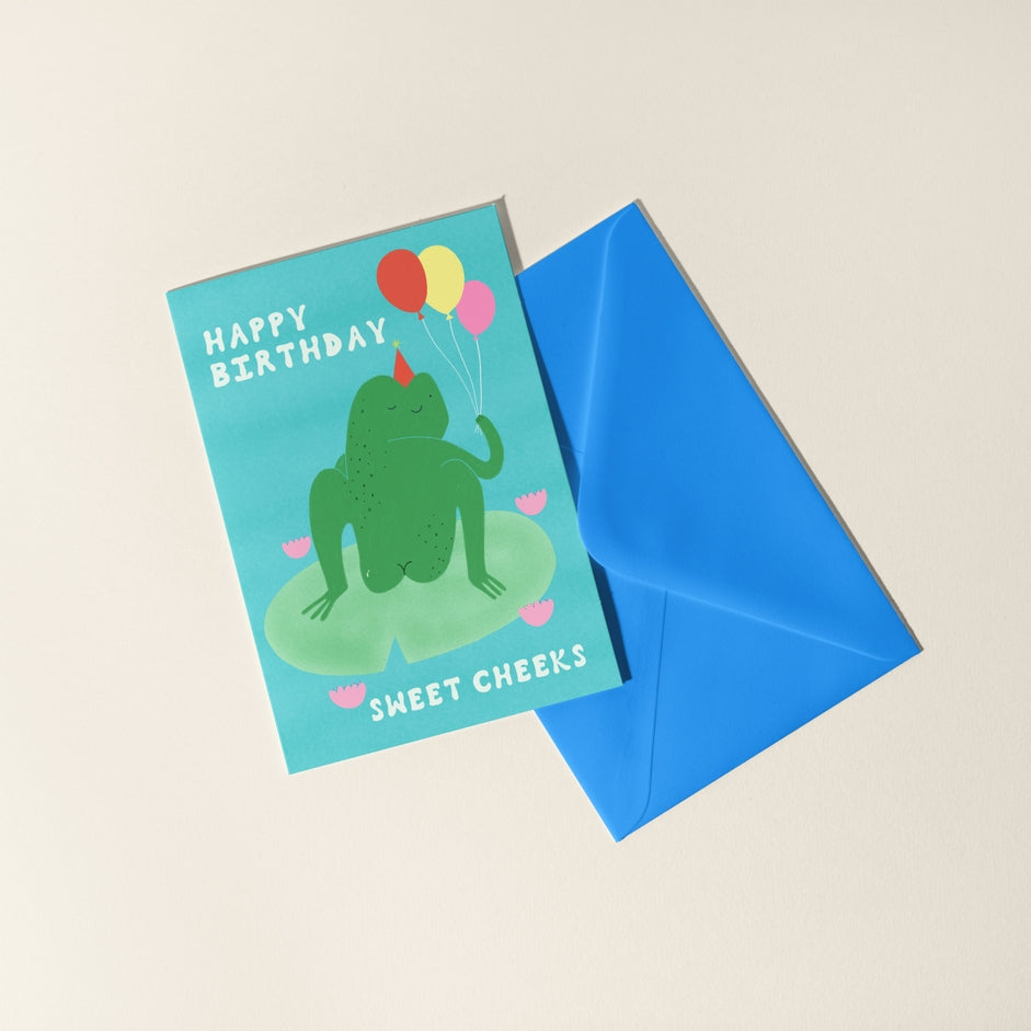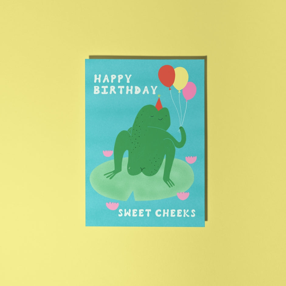 Cheeky frog with a party hat and balloons sitting on a lily pad. Text reads 'Happy Birthday, Sweet Cheeks'.