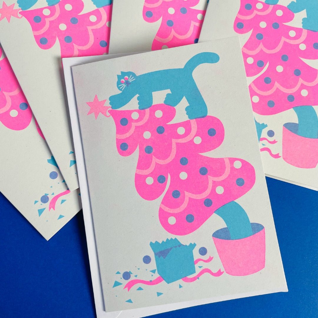 Neon pink and blue illustration of a naughty cat trying to ruin the Christmas tree. Single card packaged in an individual eco friendly cellulose clear bag.