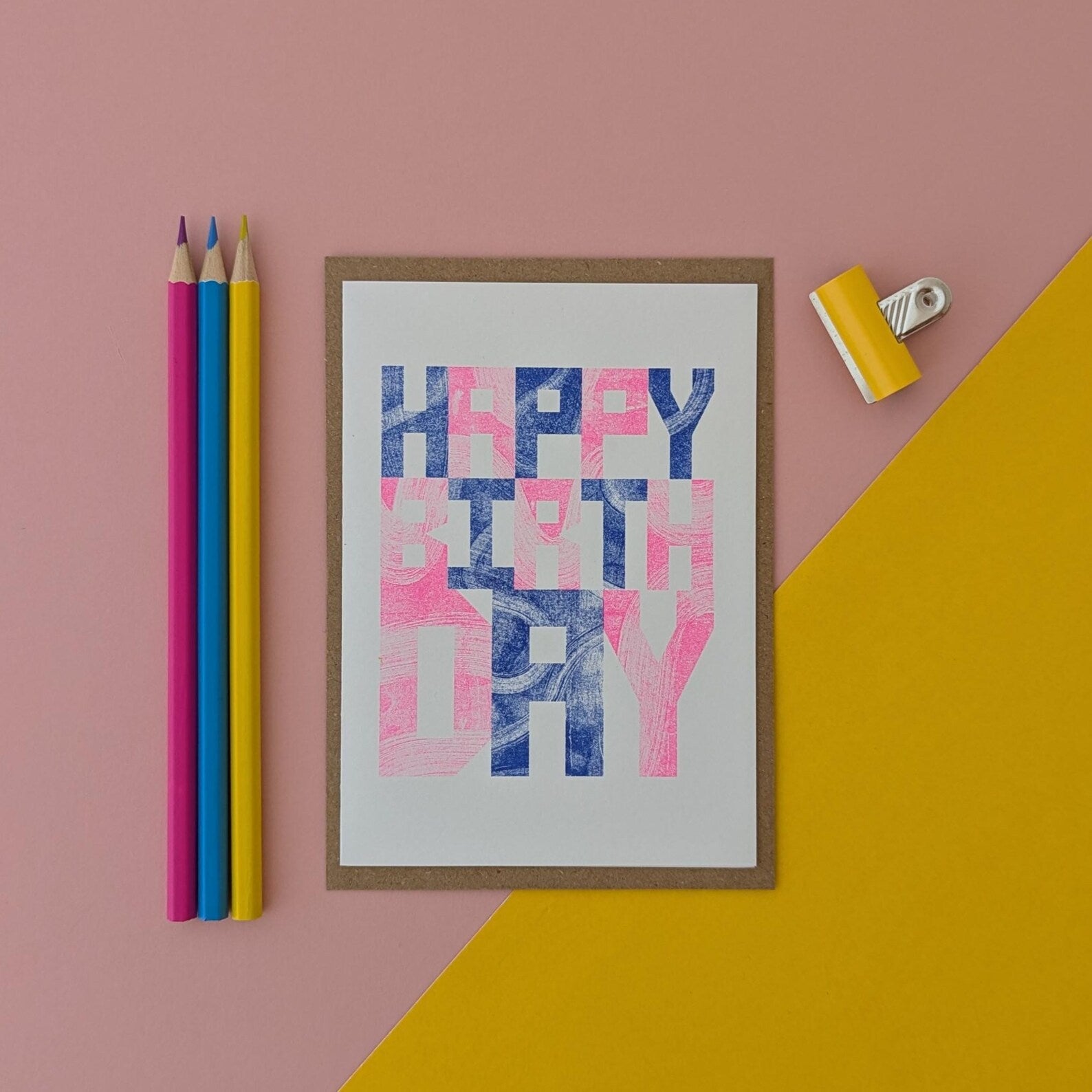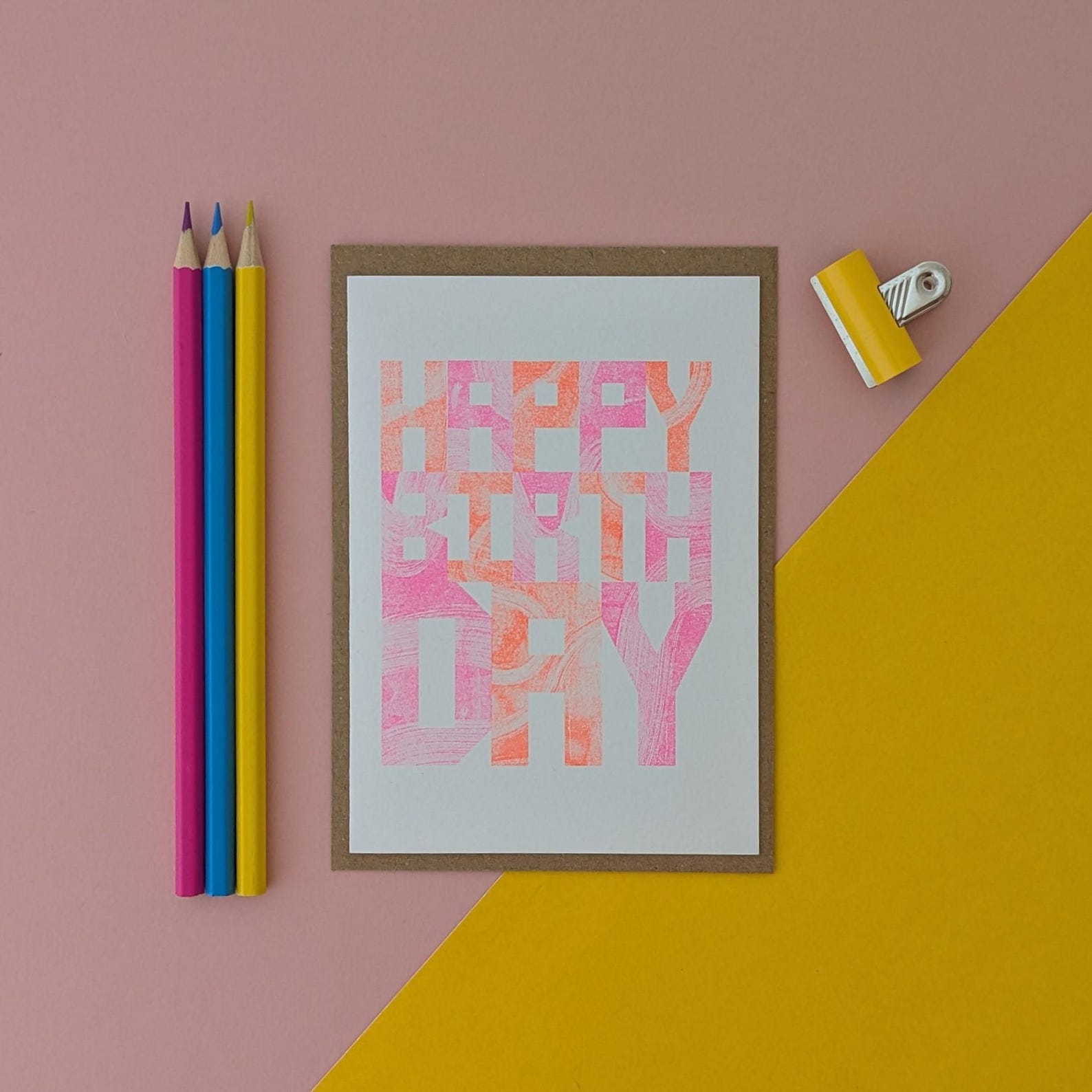This vibrant riso printed birthday card features bold custom lettering and cool brush stroke textures.