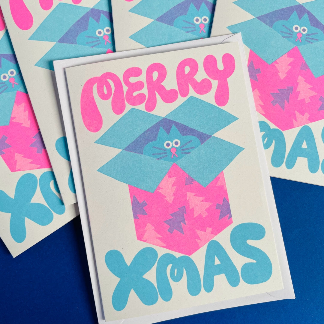 Neon pink and blue illustration of a cheeky cat in a present box with the words merry xmas around it...Single card packaged in an individual eco friendly cellulose clear bag.