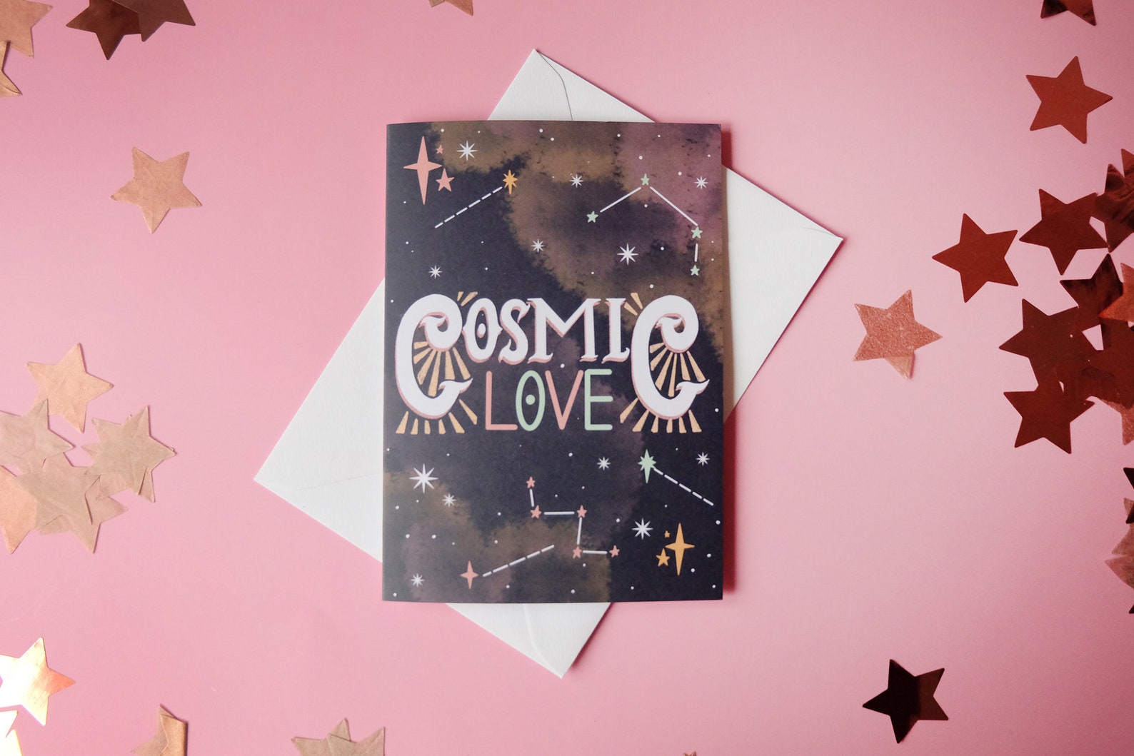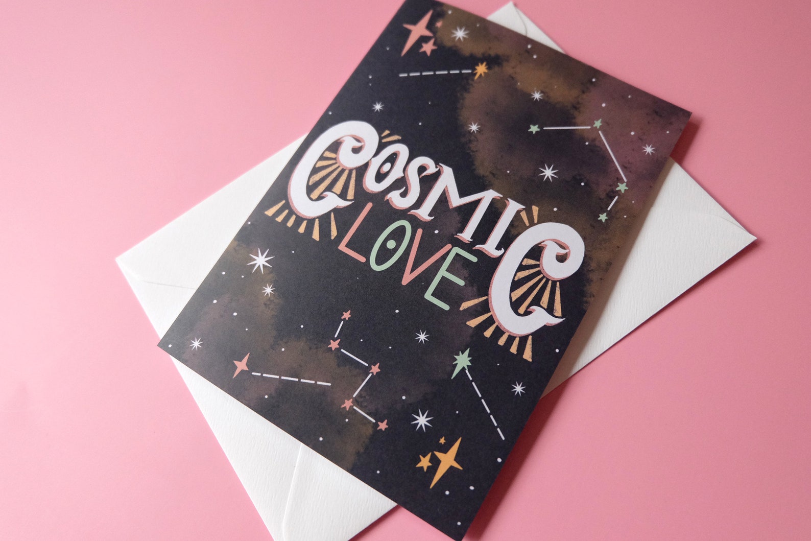 Digitally illustrated card featuring hand illustrated type set amongst constellations in the cosmos; Perfect for weddings, anniversaries and any occasion of love!