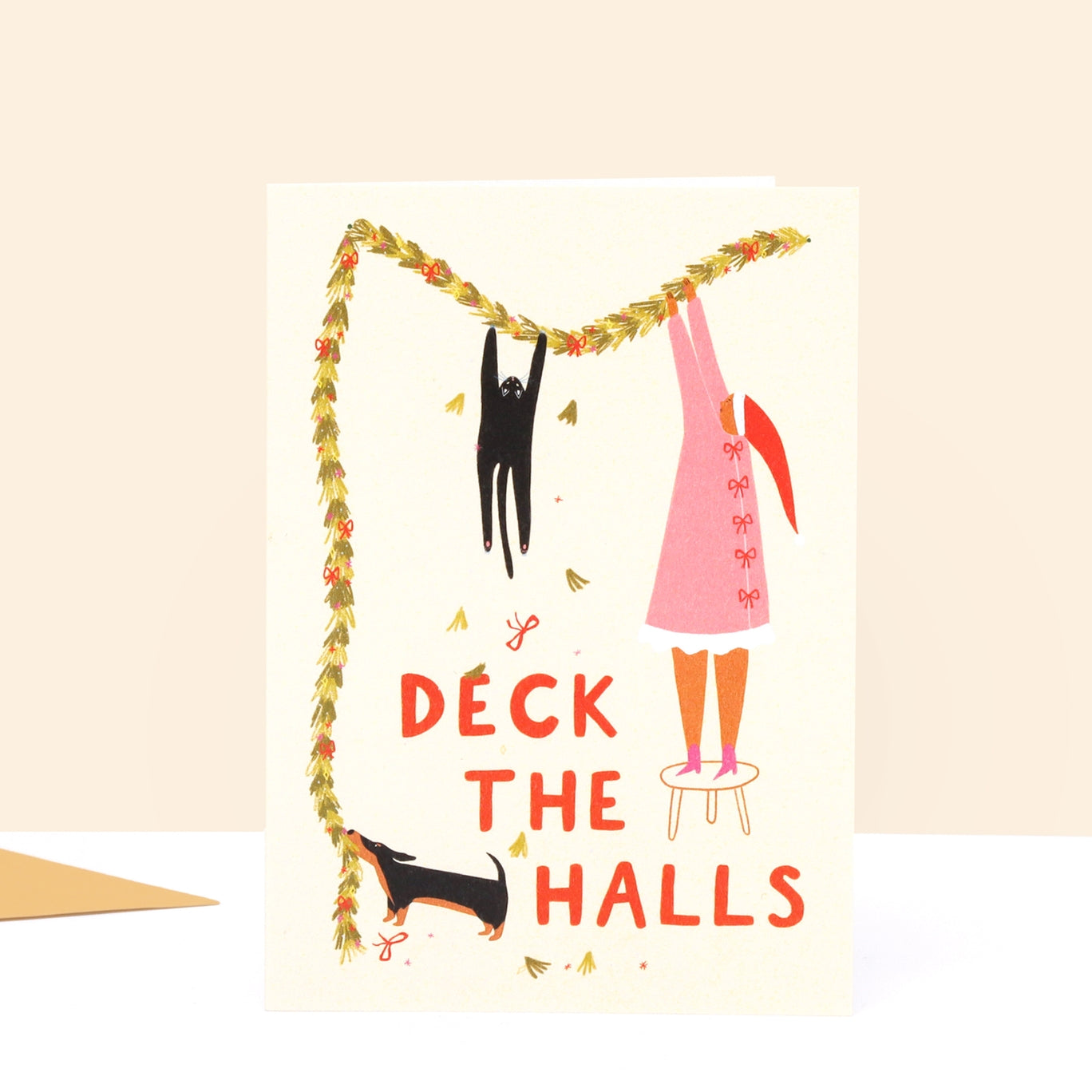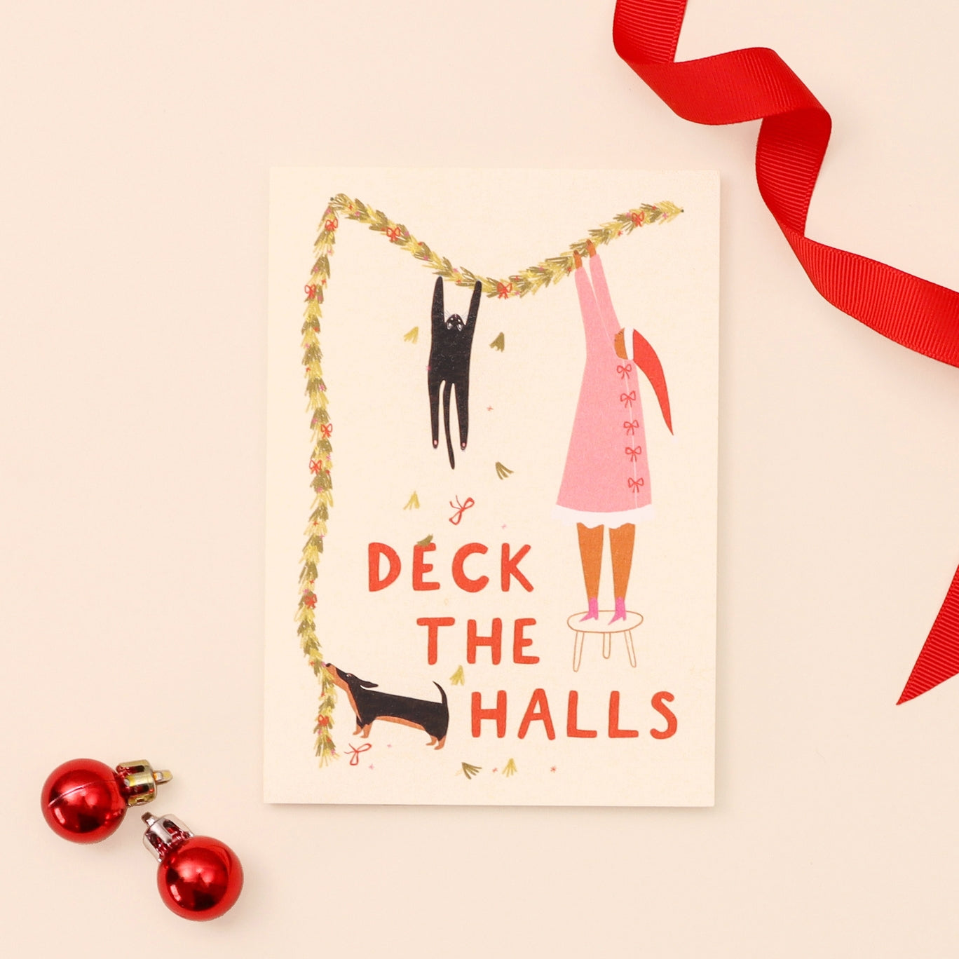 Christmas card featuring a naughty black cat and dachshund dog helping their owner decorate. A humorous Christmas card for pet owners.