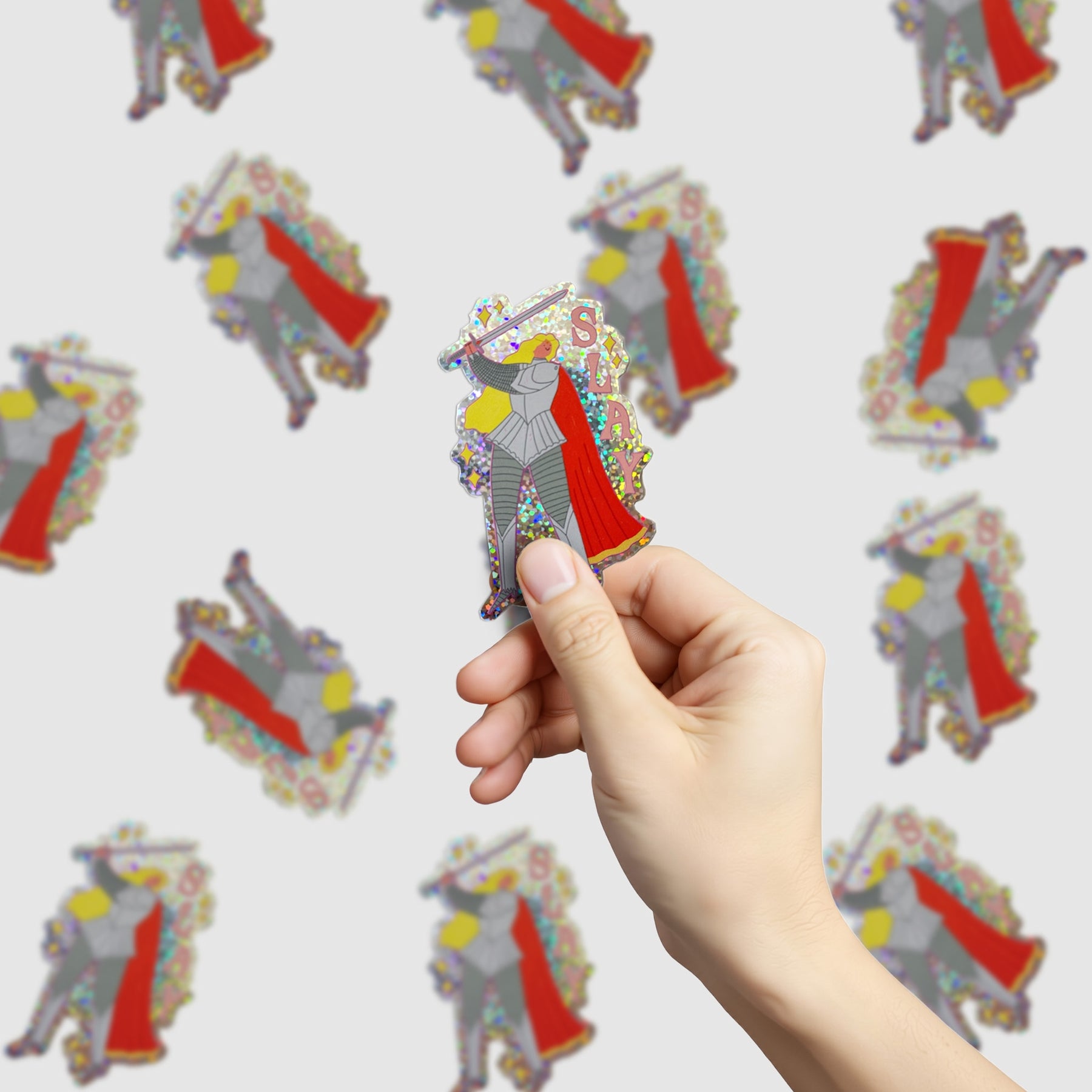Vinyl glittery die cut sticker featuring a knight with pink text reading 'SLAY' perfect for lovers of fantasy and romantasy.