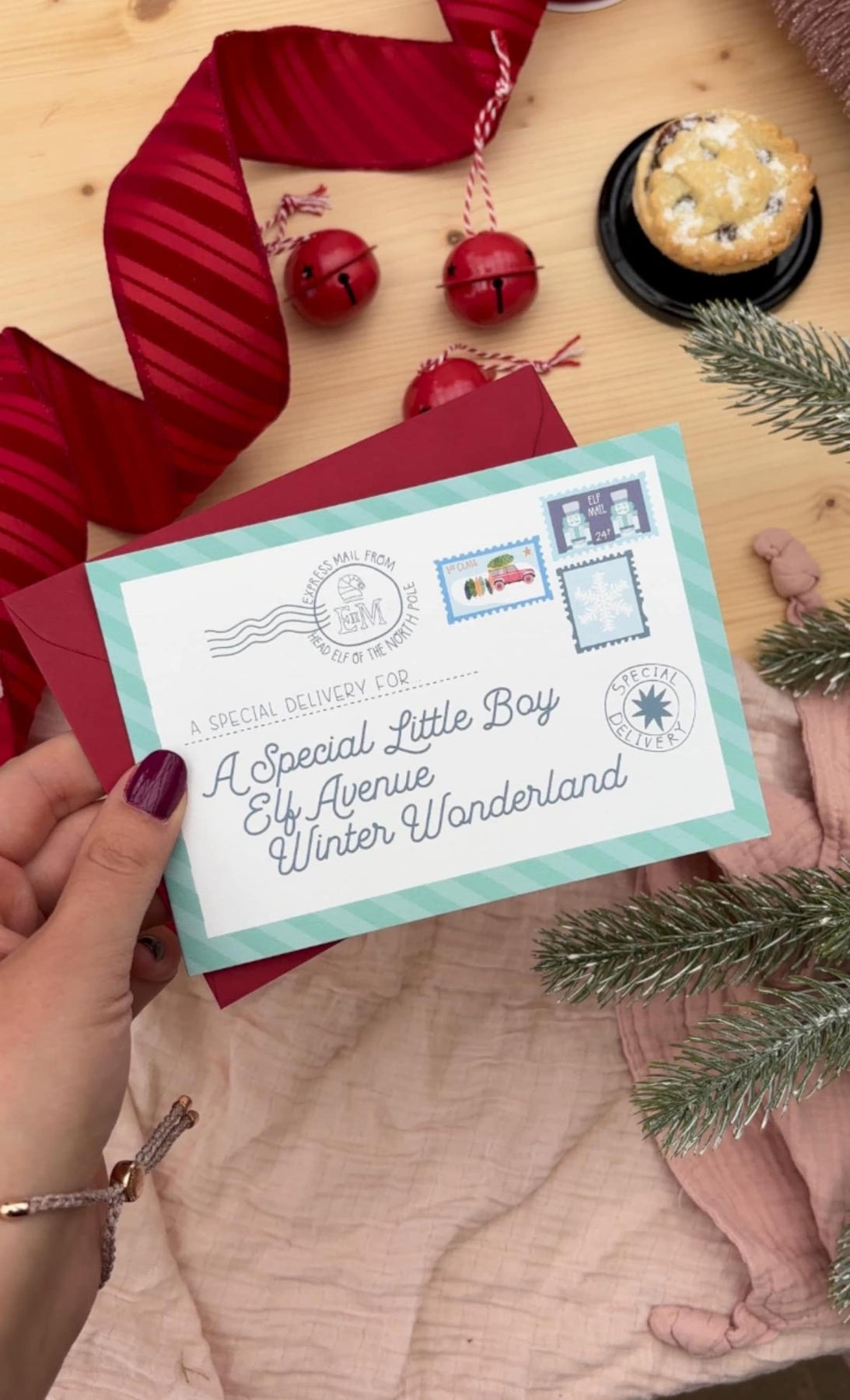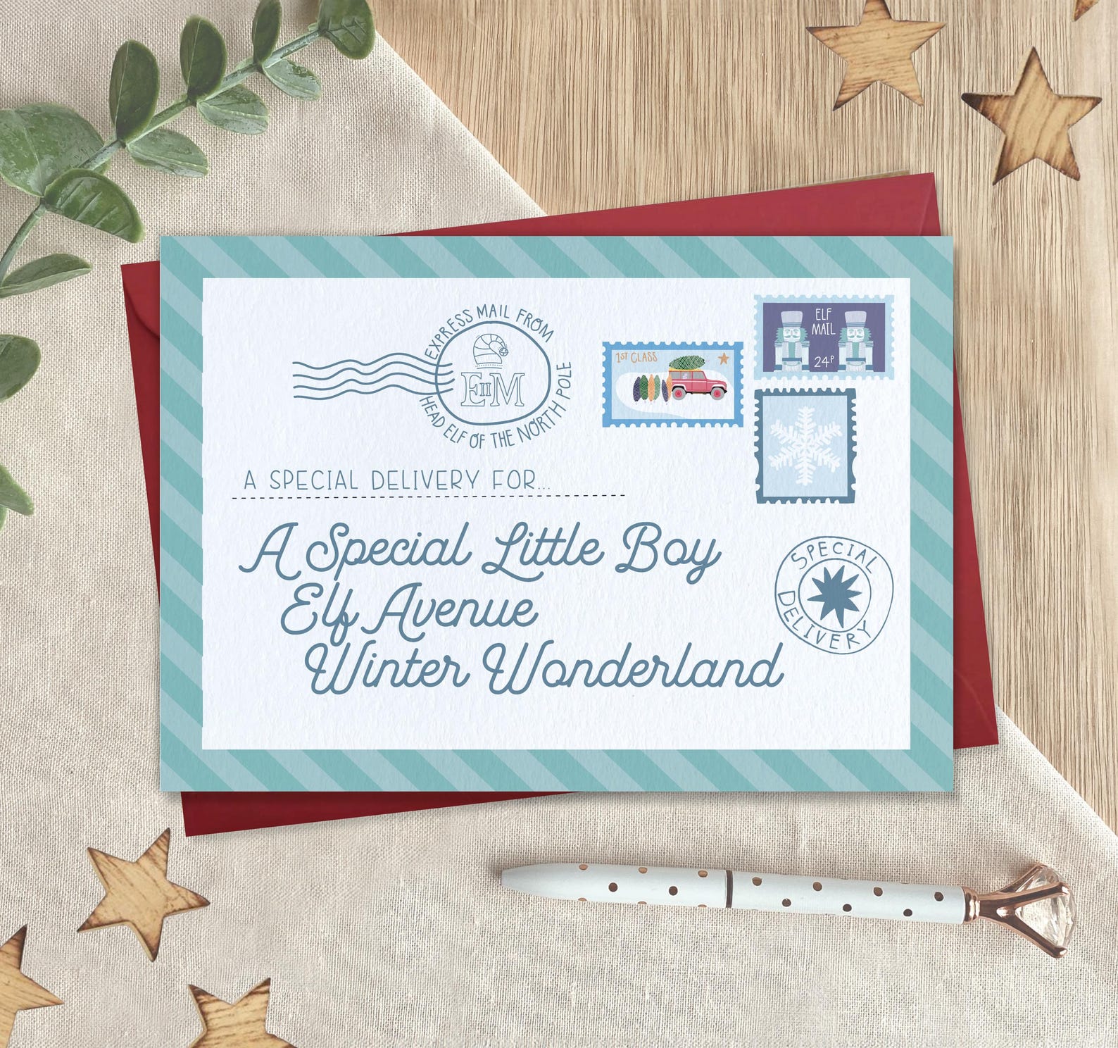 A cute card designed to look like an air mail postcard but in lovely bright Christmassy colours. It is addressed as follows: 'a Special Little Boy, Elf Avenue, Winter Wonderland' and is a nice card to send to your Son, Grandson, Great Grandson, Nephew, Friend