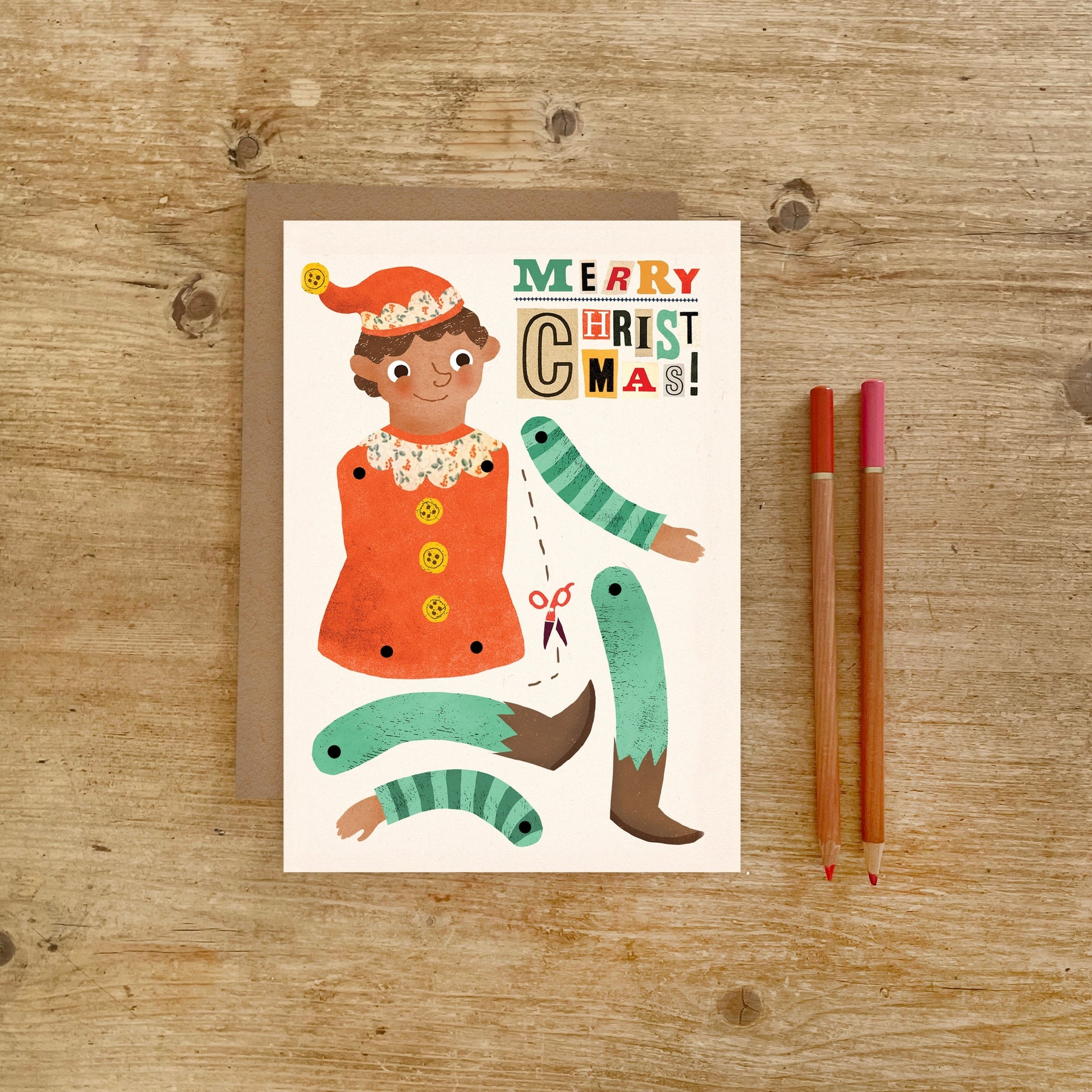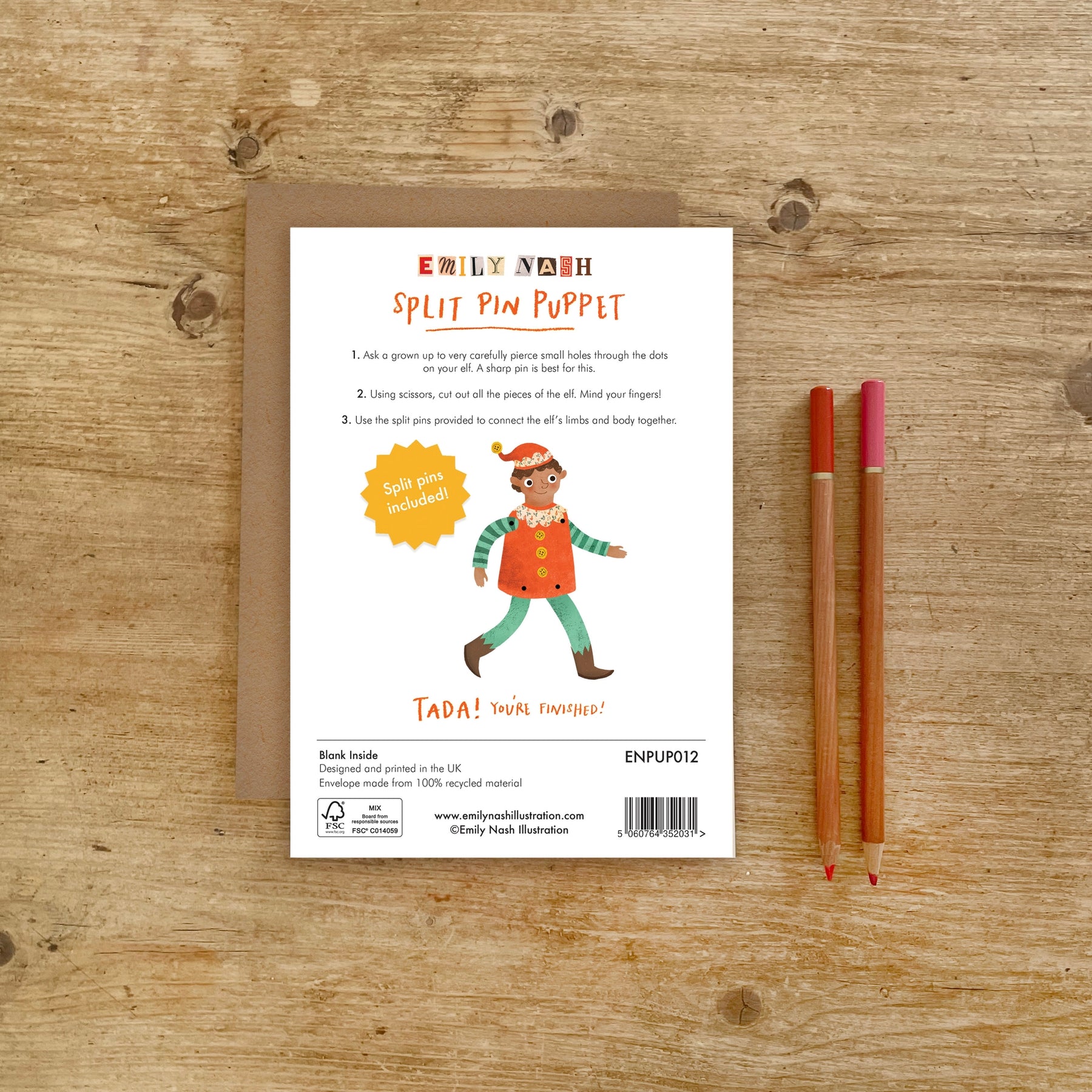 Illustrated Christmas Elf greeting card which can be cut out to make a split pin puppet!