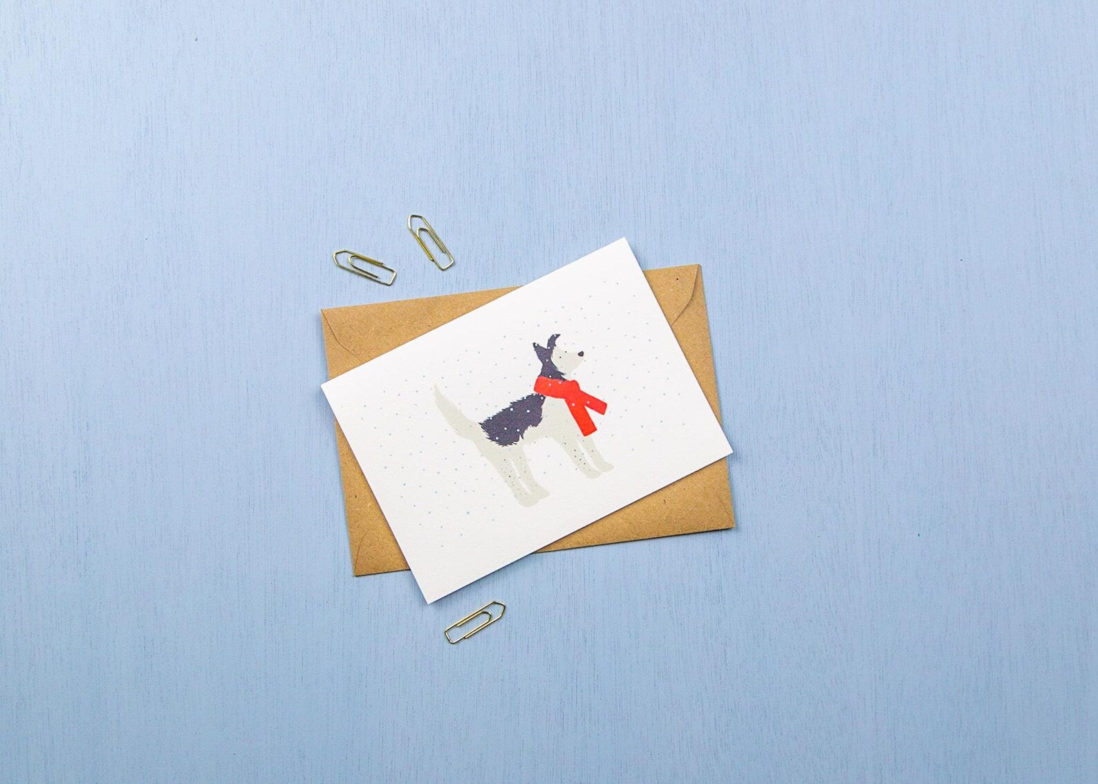 A Christmas card for all the dog lovers out there! A happy little collie out in the snow, wearing a red Christmas scarf.