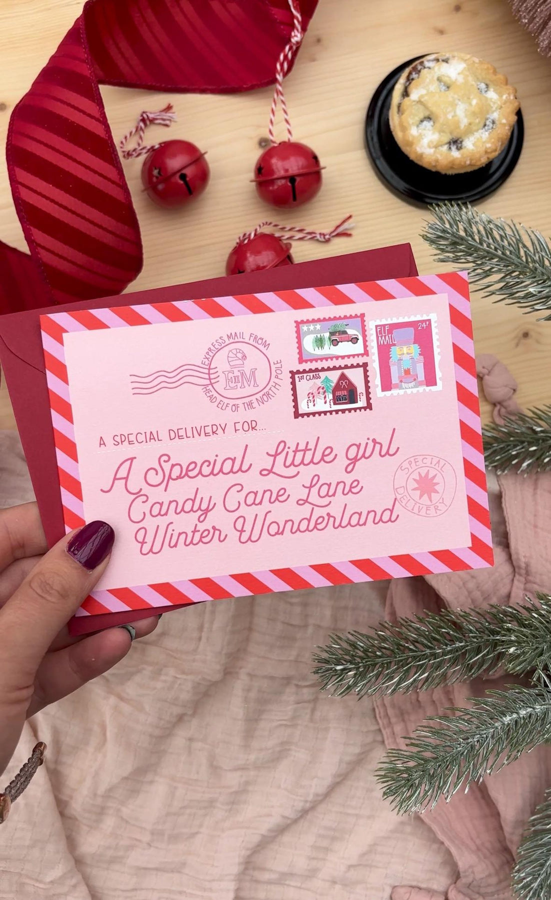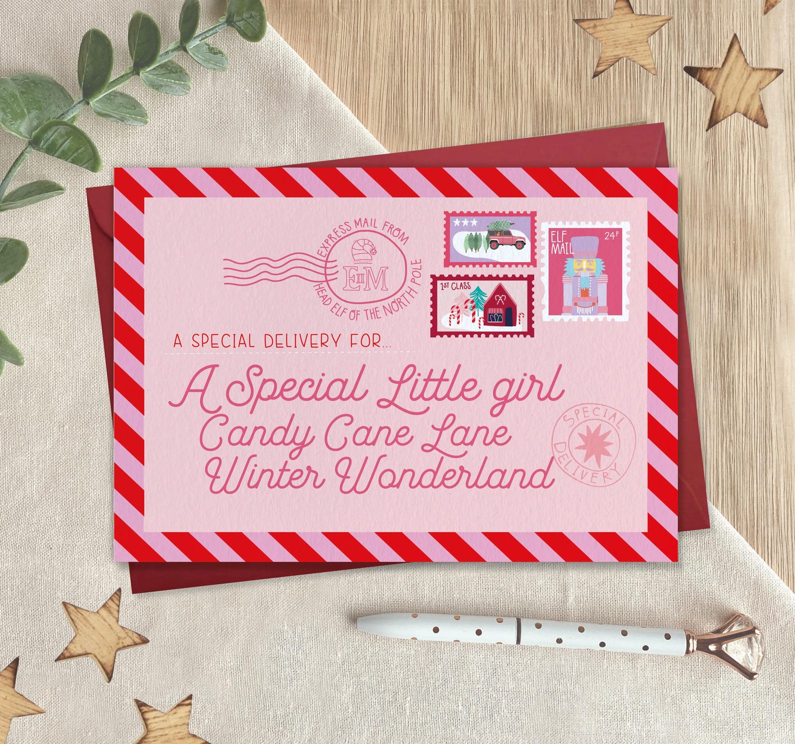 A cute card designed to look like an air mail postcard but in lovely bright Christmassy colours. It is addressed as follows: 'a Special Little Girl, Candy Cane Lane, Winter Wonderland' and is a nice card to send to your Daughter, Granddaughter, Great Granddaughter, Niece, Friend