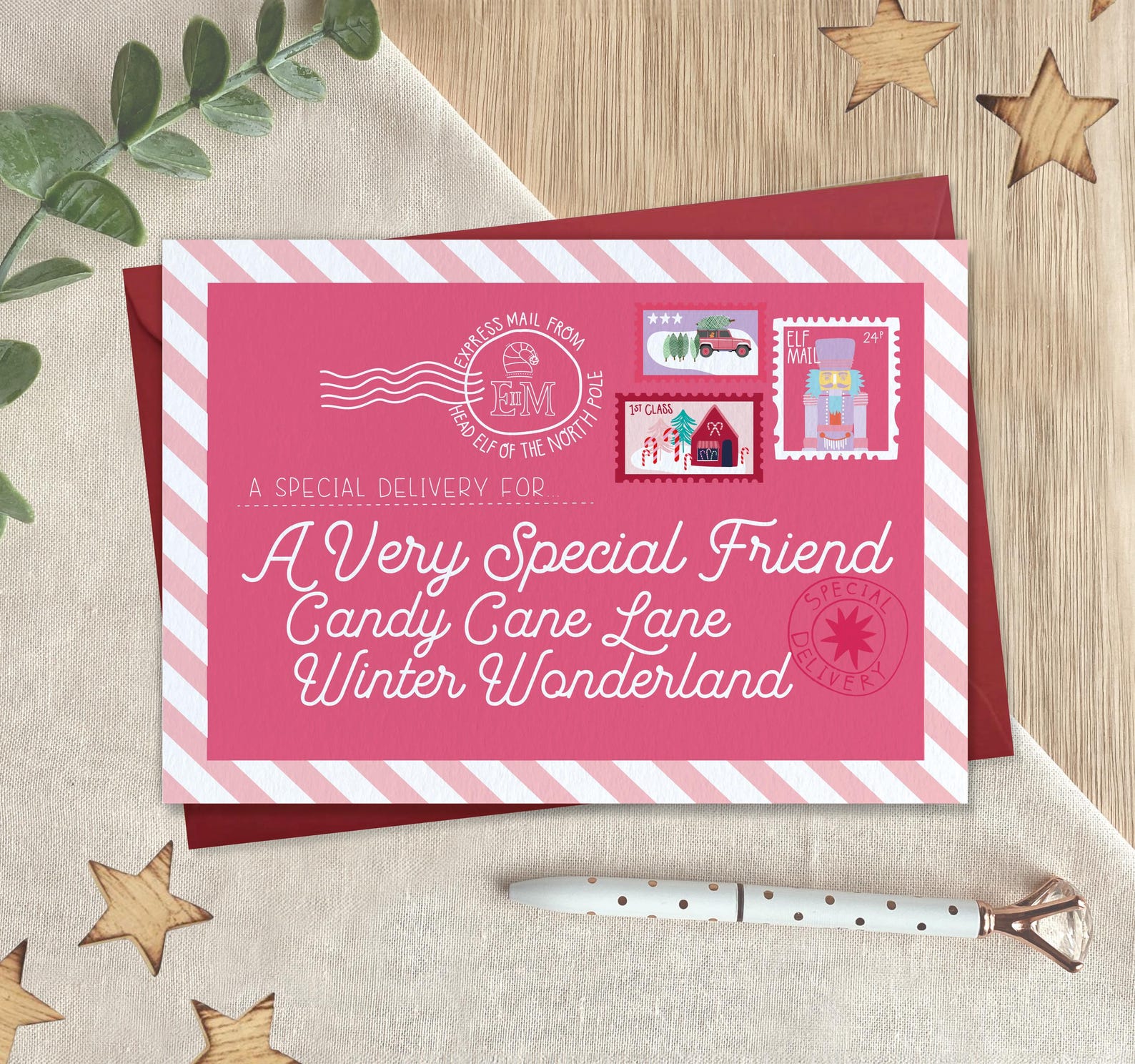 A cute card designed to look like an air mail postcard but in lovely bright Christmassy colours. It is addressed as follows: 'A Very Special Friend, Candy Cane Lane, Winter Wonderland' and is a nice card to send to your friend this christmas