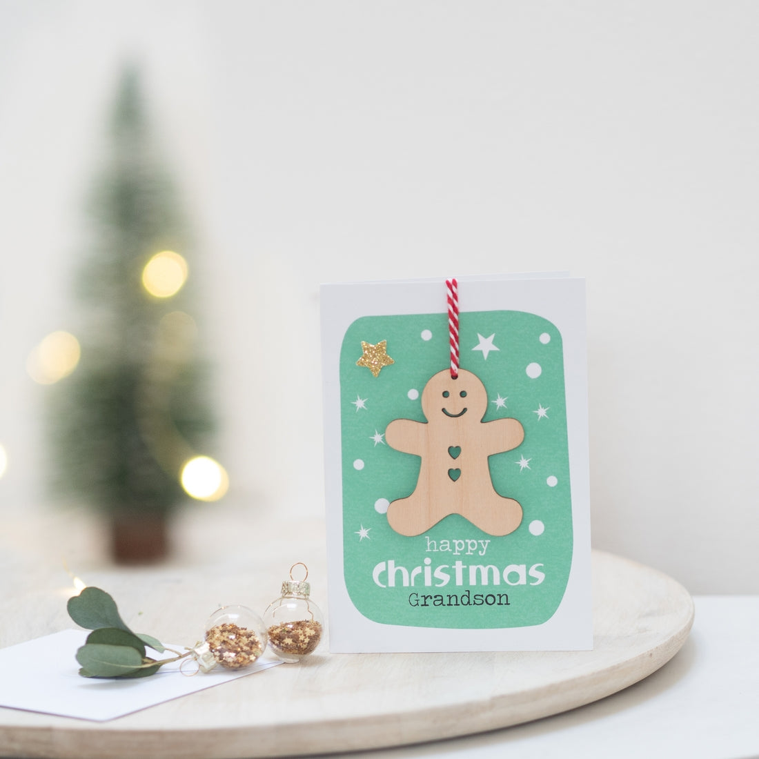 Christmas card with a wooden gingerbread man decoration to keep Decoration can be re-used as a tree decoration, gift tag or place setting. Beautiful left plain, or can be coloured-in/painted/decorated to match any festive theme