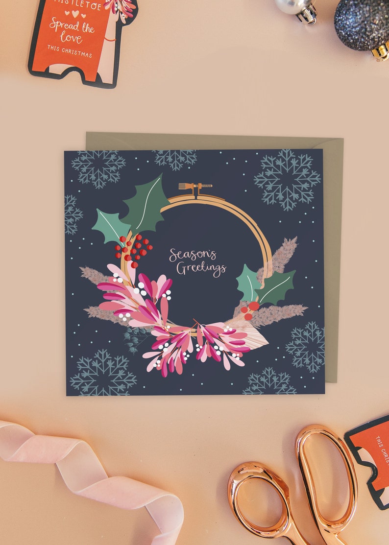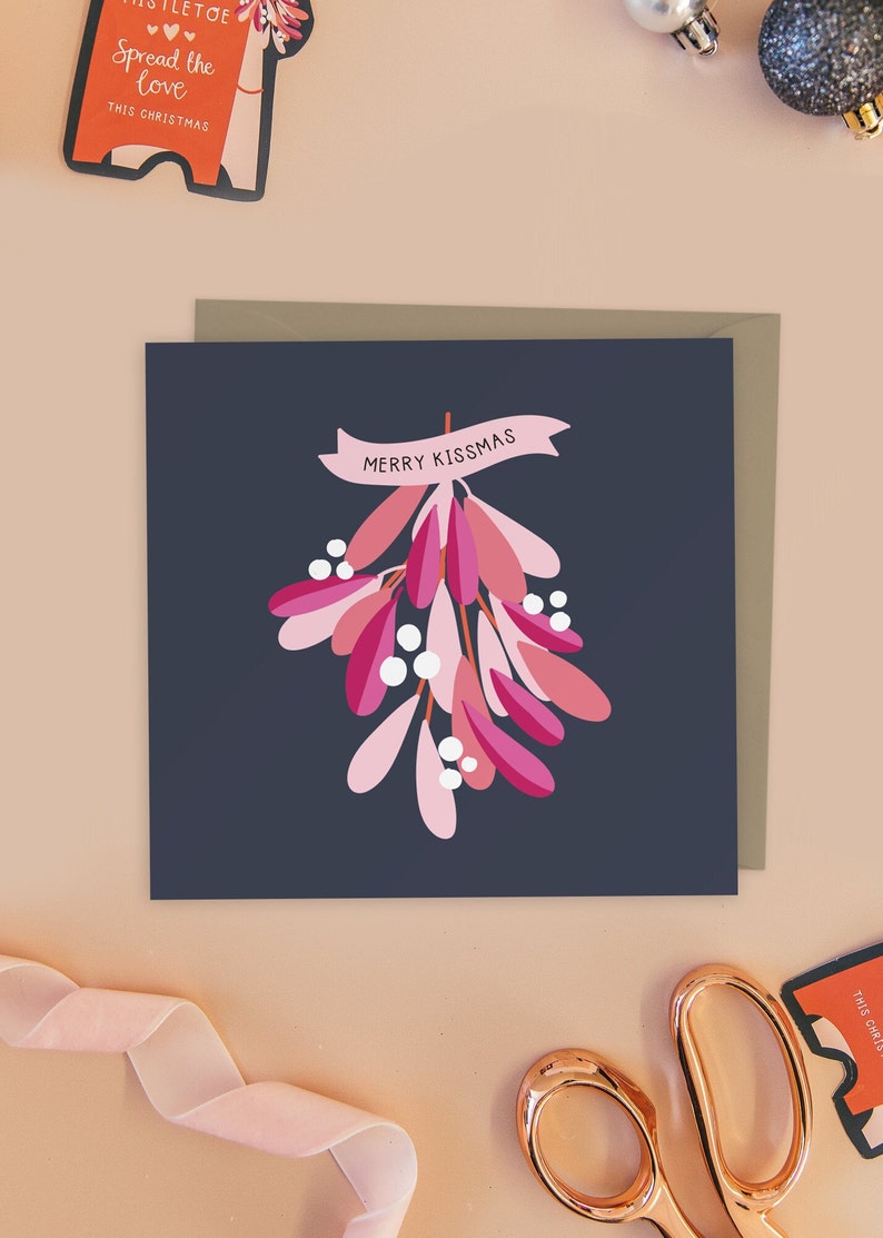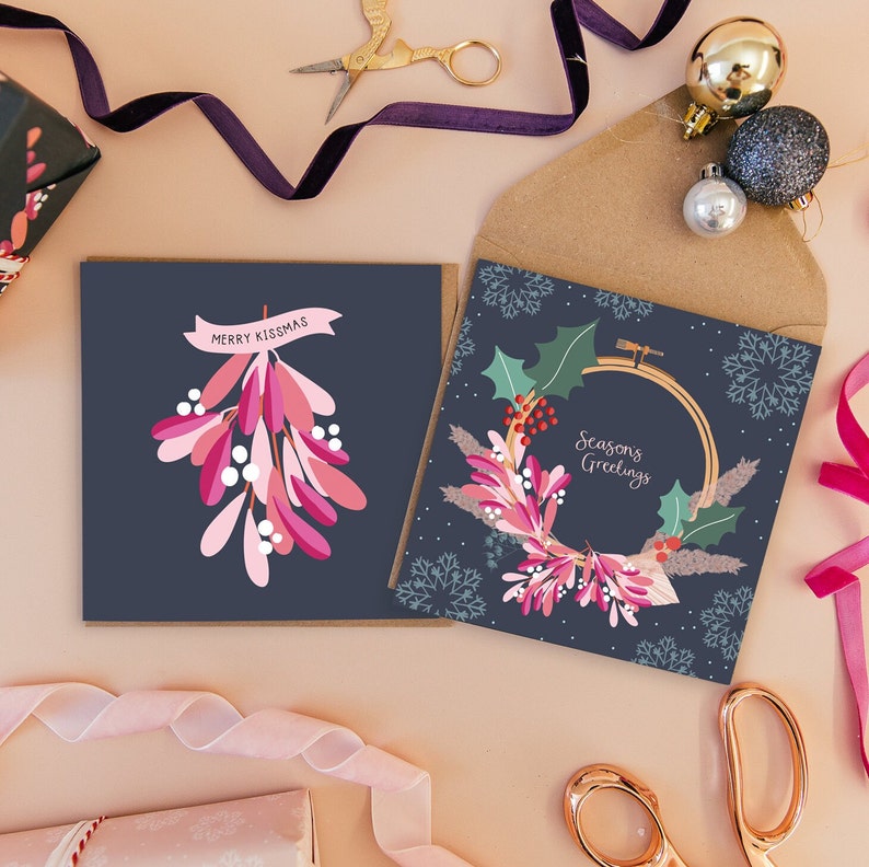 The Mistletoe is the centrepiece in this collection, illustrated in a fun colour palette of blush pinks and peaches, with a moody, complimentary deep blue blackground.