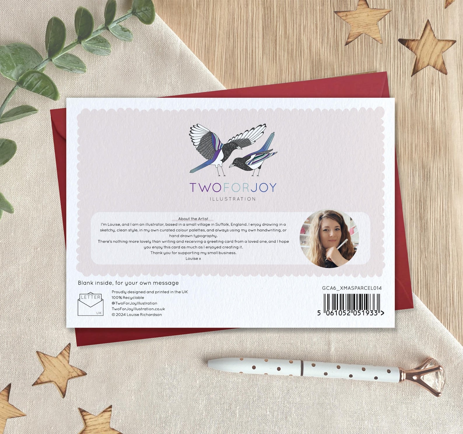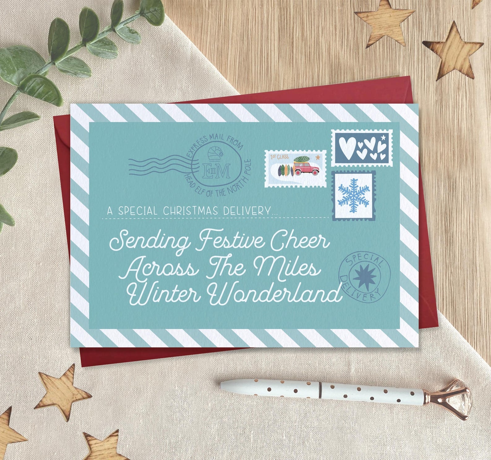 A cute card designed to look like an air mail postcard but in lovely bright Christmassy colours. It is addressed as follows: 'Sending Festive Cheer, Across The Miles, Winter Wonderland' and is a nice card to send to your Long Distance Friends or Family