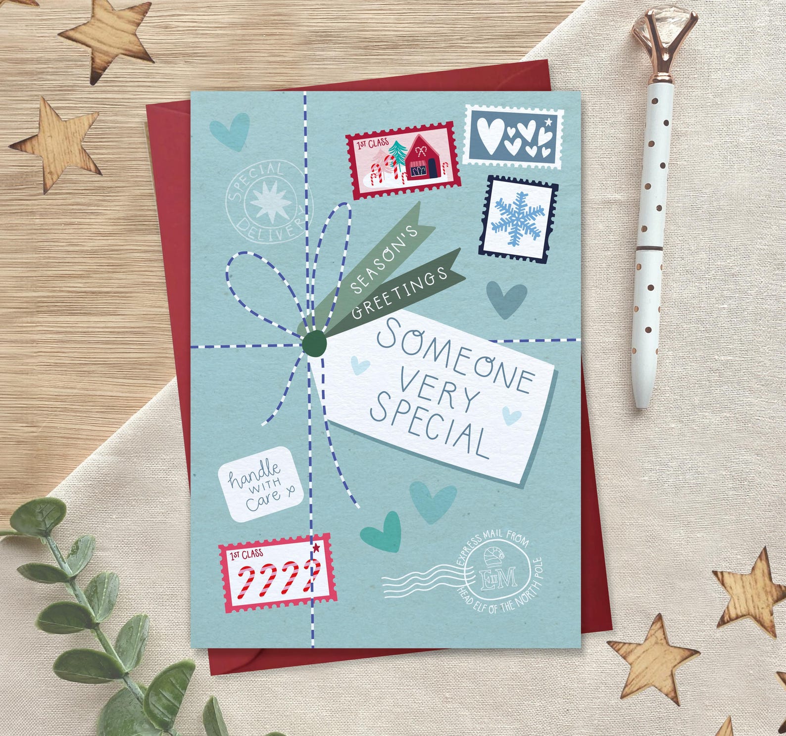 A cute card designed to look like a christmas parcel wrapped up in string, with a big tag which says 'someone very special' - it can be gifted to anyone you love including your Best friend, sister, brother, mum, dad, son, daughter