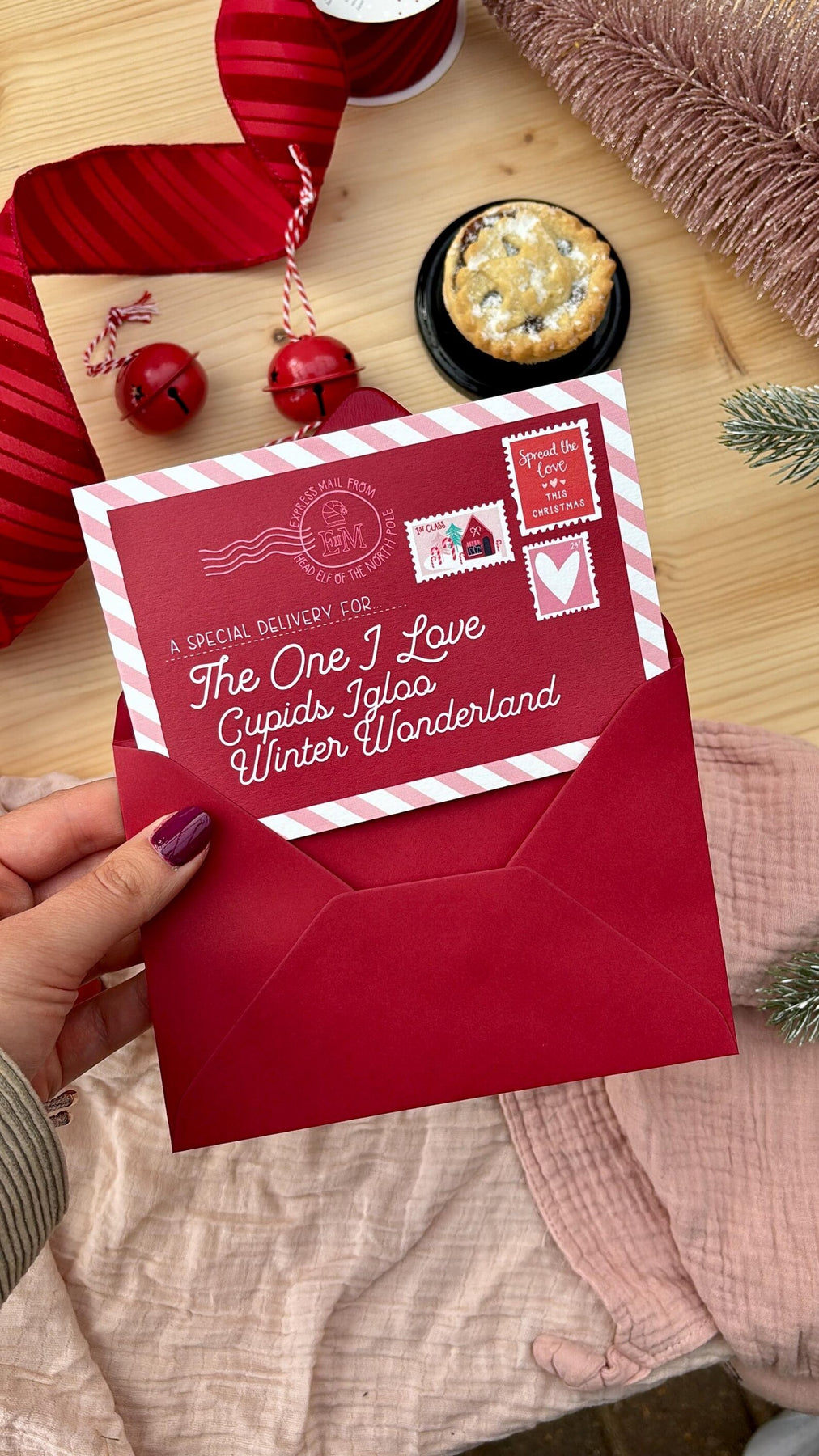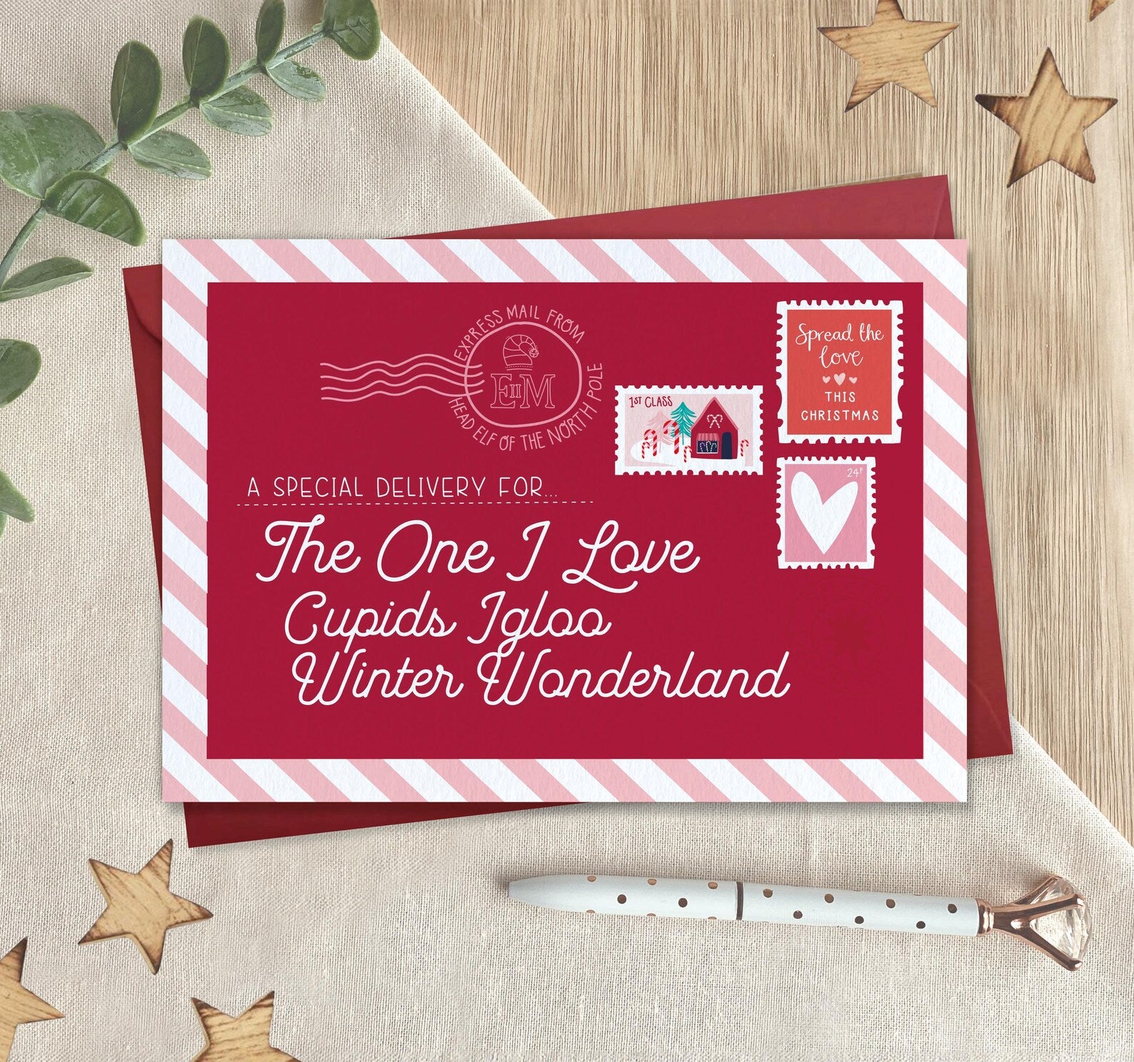 A cute card designed to look like an air mail postcard but in lovely bright Christmassy colours. It is addressed as followers: 'To the One i Love, Cupids Igloo, Winter Wonderland' and is a nice card to send to your significant other - Boyfriend, Girlfriend, Wife, Husband, Soulmate