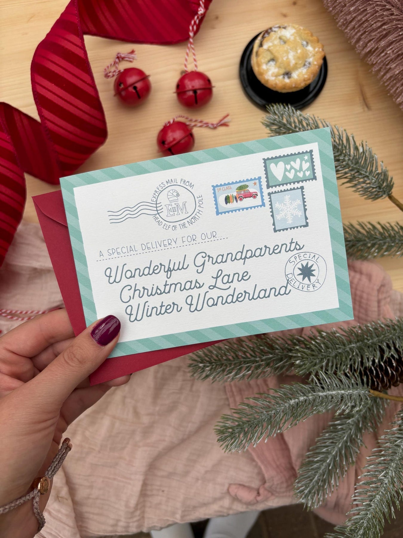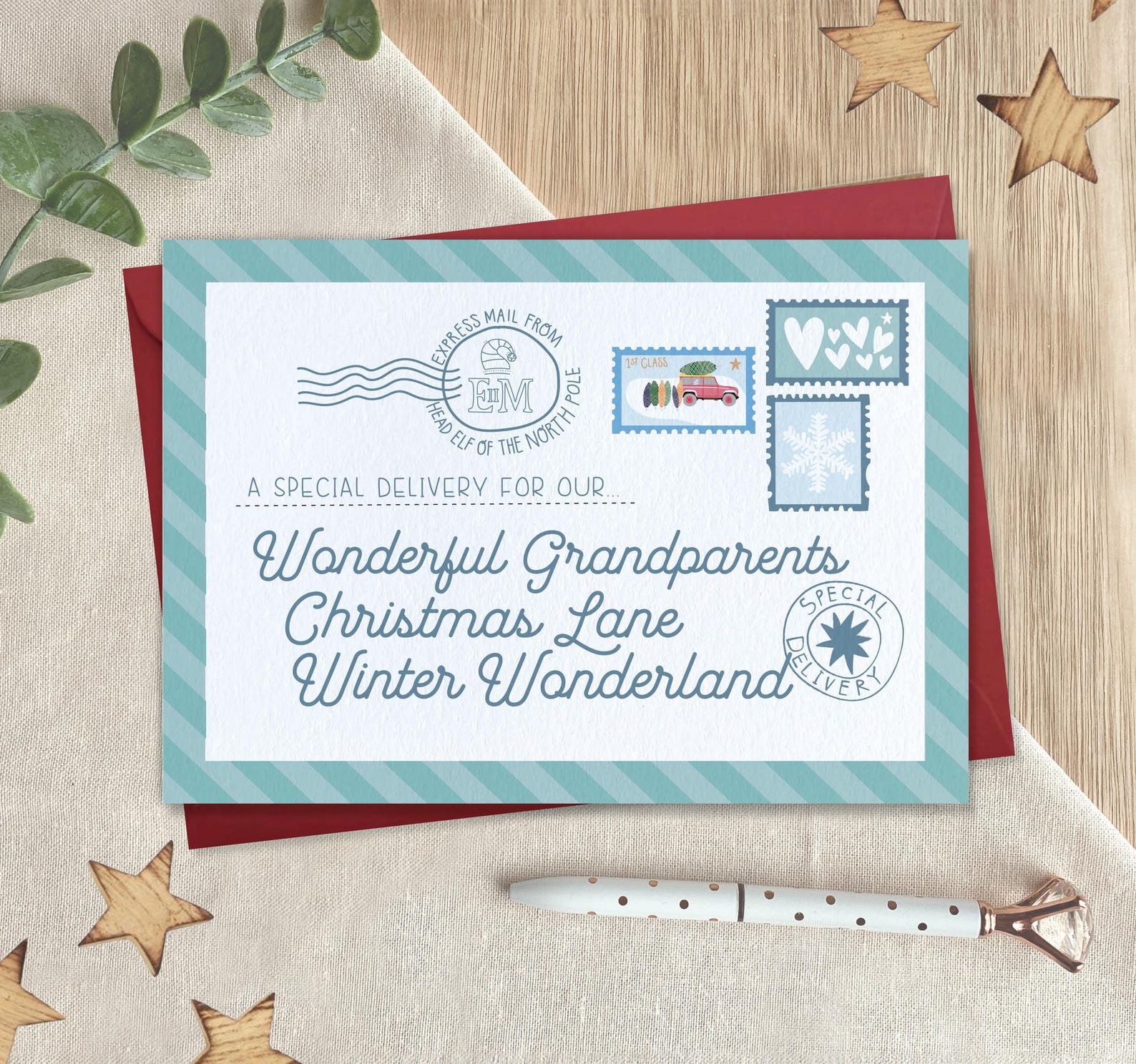 A cute card designed to look like an air mail postcard but in lovely bright Christmassy colours. It is addressed as followering: 'Wonderful Grandparents, Christmas Lane, Winter Wonderland' and is a nice card to send to your Grandparents this Christmas