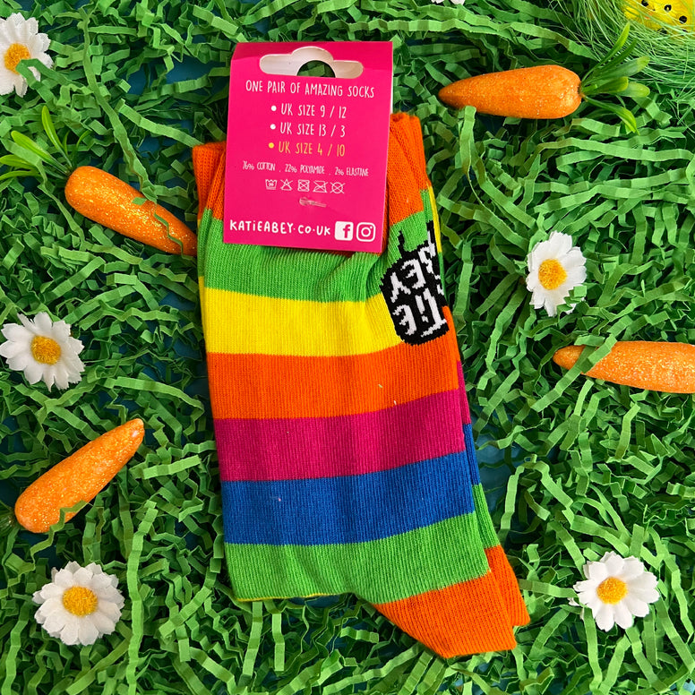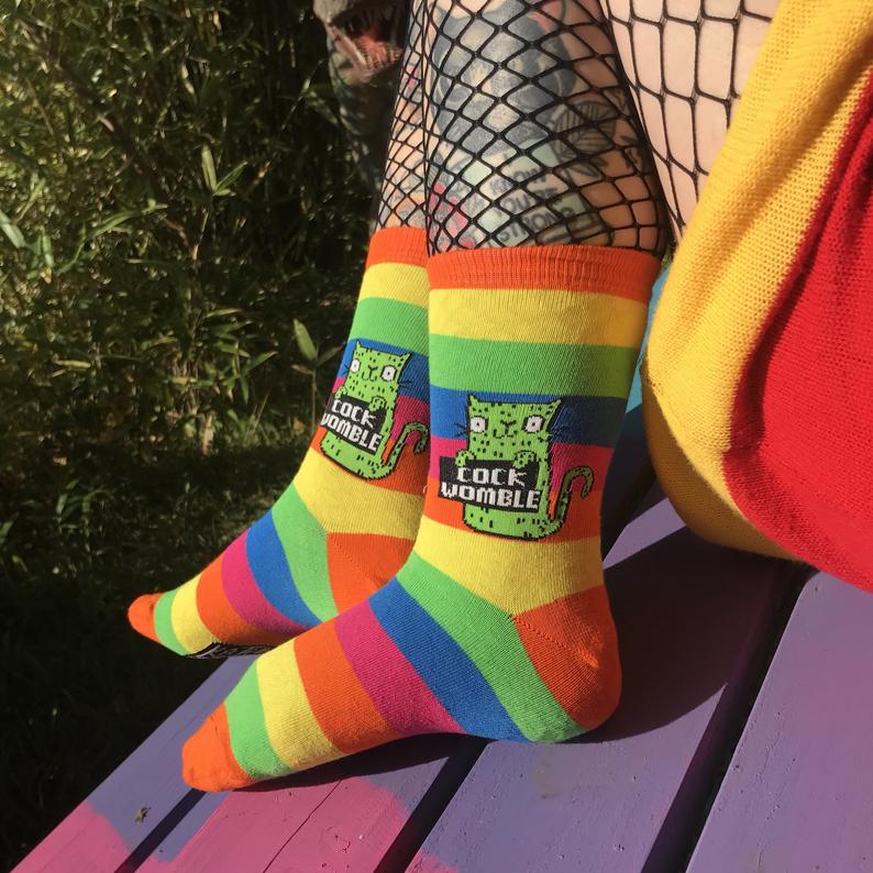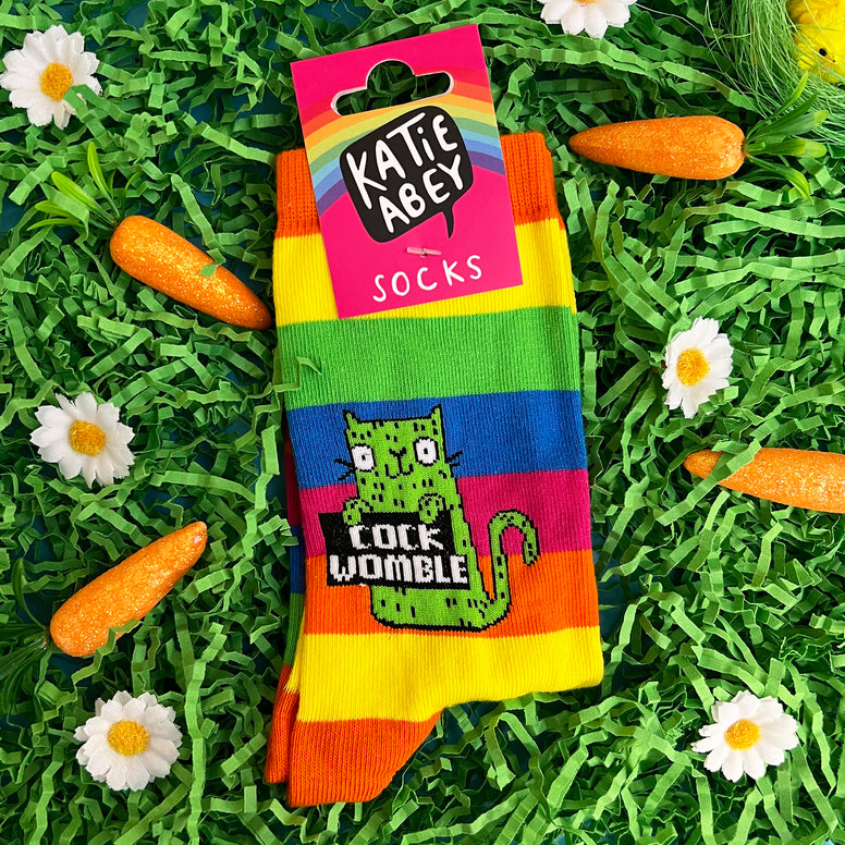 The Cock Womble cat is now in magical rainbow sock form with a Katie Abey branded sole