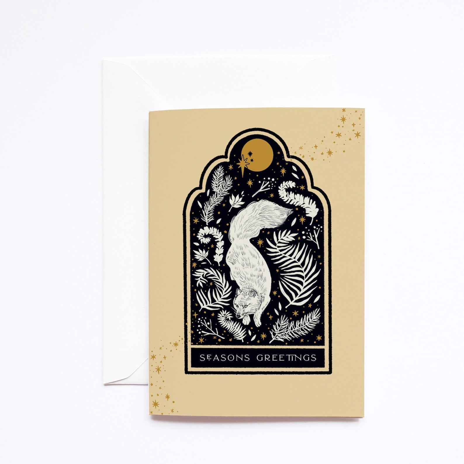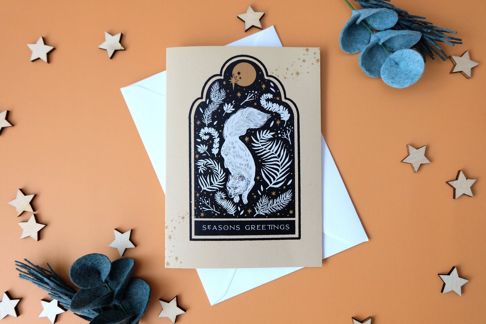 Digitally and intricately illustrated, this Christmas cards feature a beautiful arctic fox surrounded by nordic foliage and sparkling stars, all under a full golden moon.