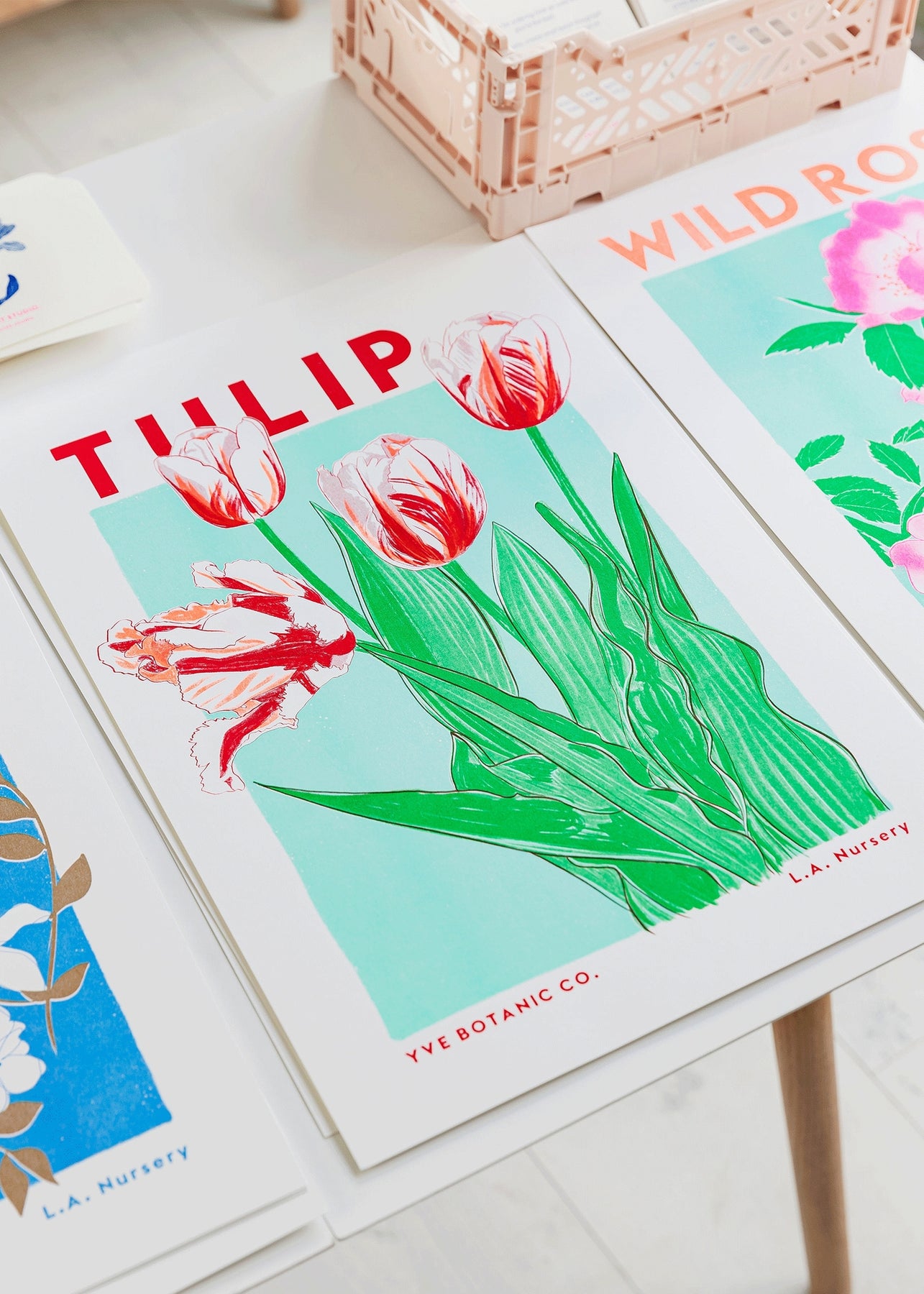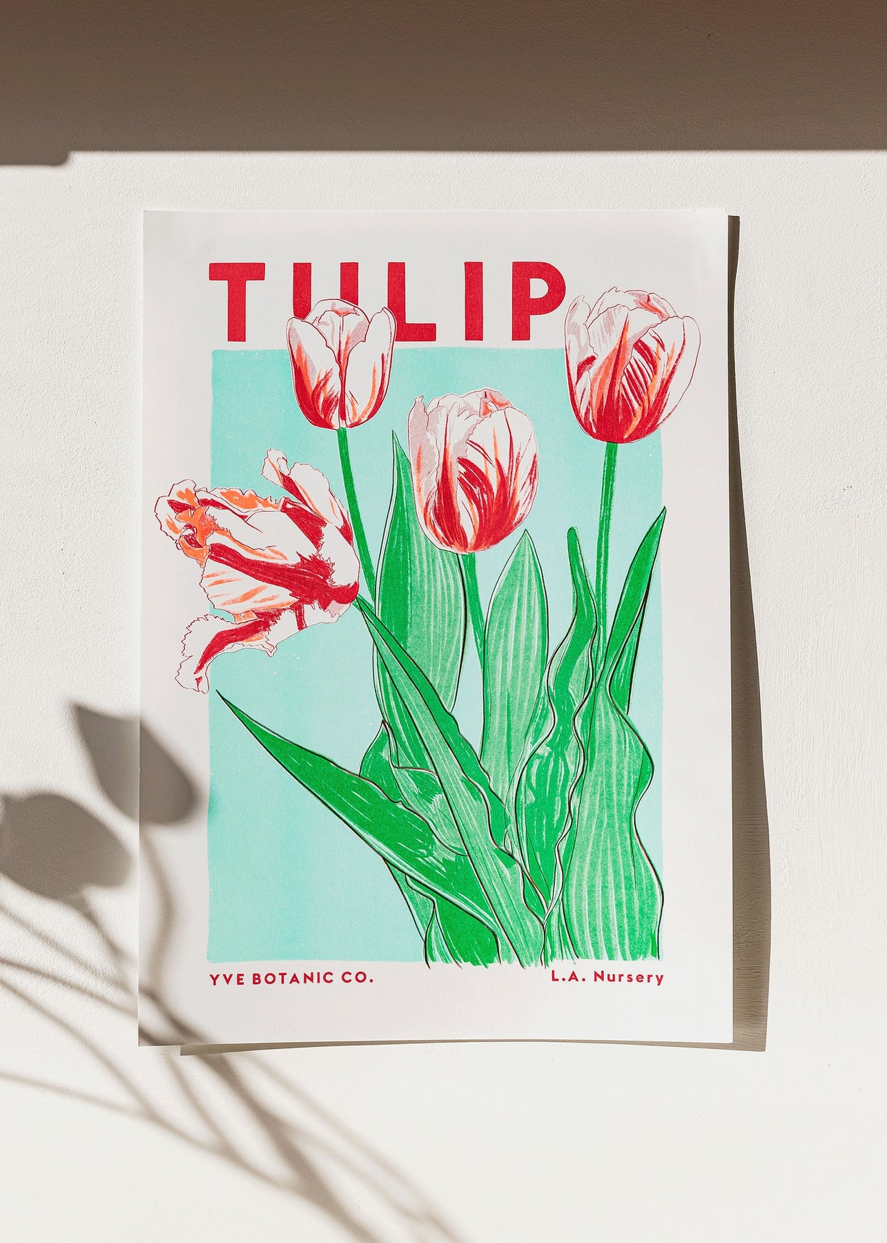 Our Tulip Risograph print in bright red, fluoro orange, green and mint plant based ink.