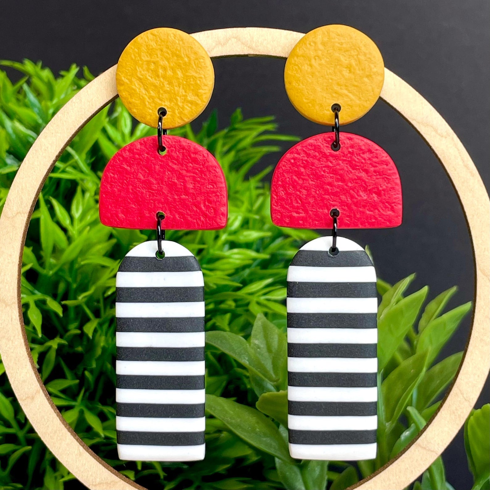 This earring combo is a circle top and a chunky arch dangle.
