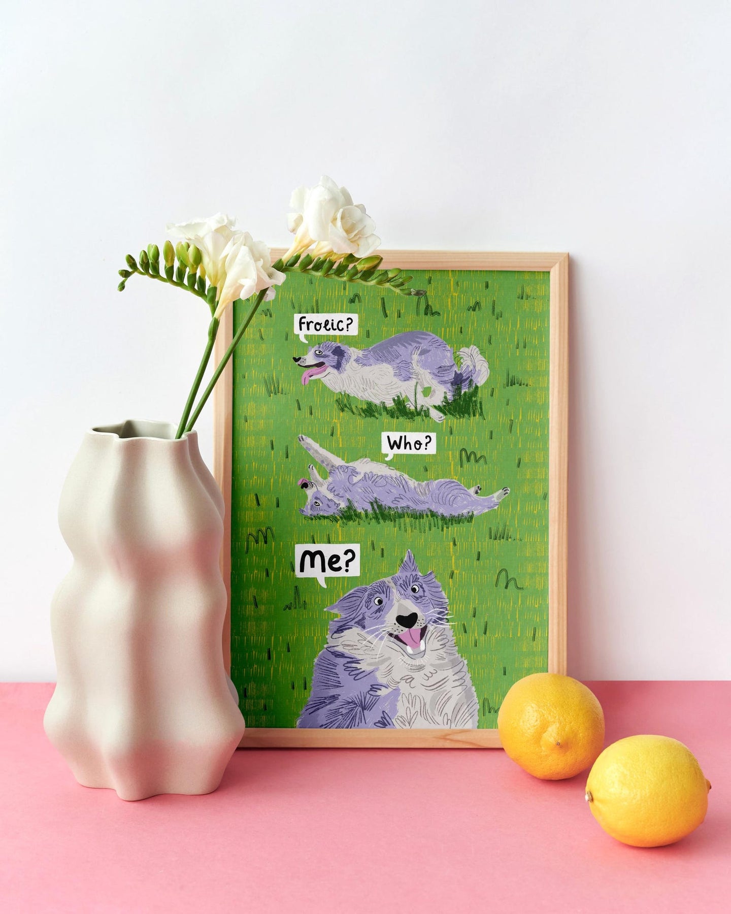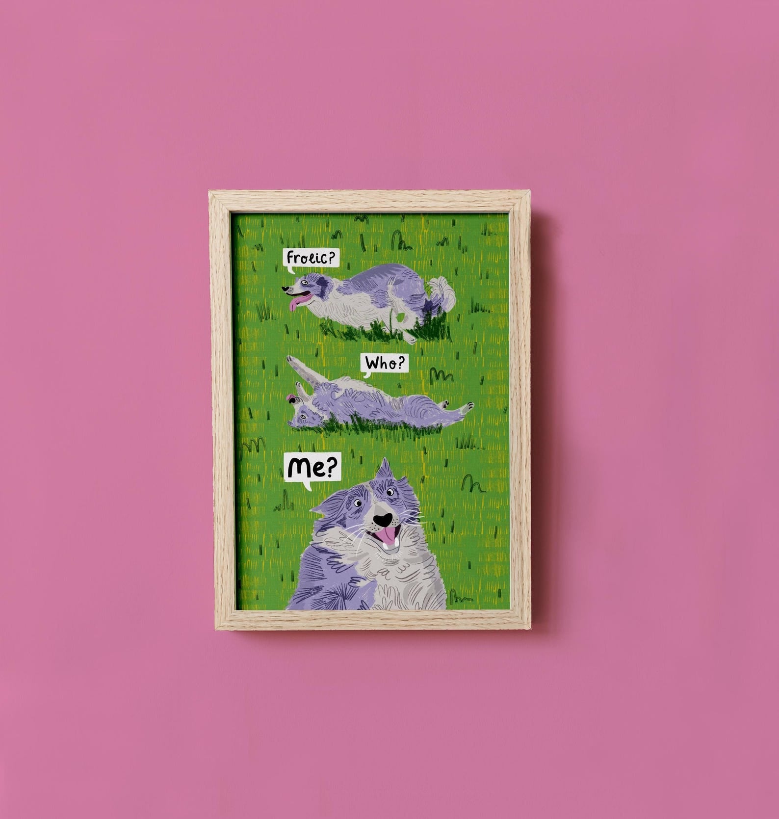 'Frolic? Who? Me?' Art print featuring a cheeky frolicking Border Collie.