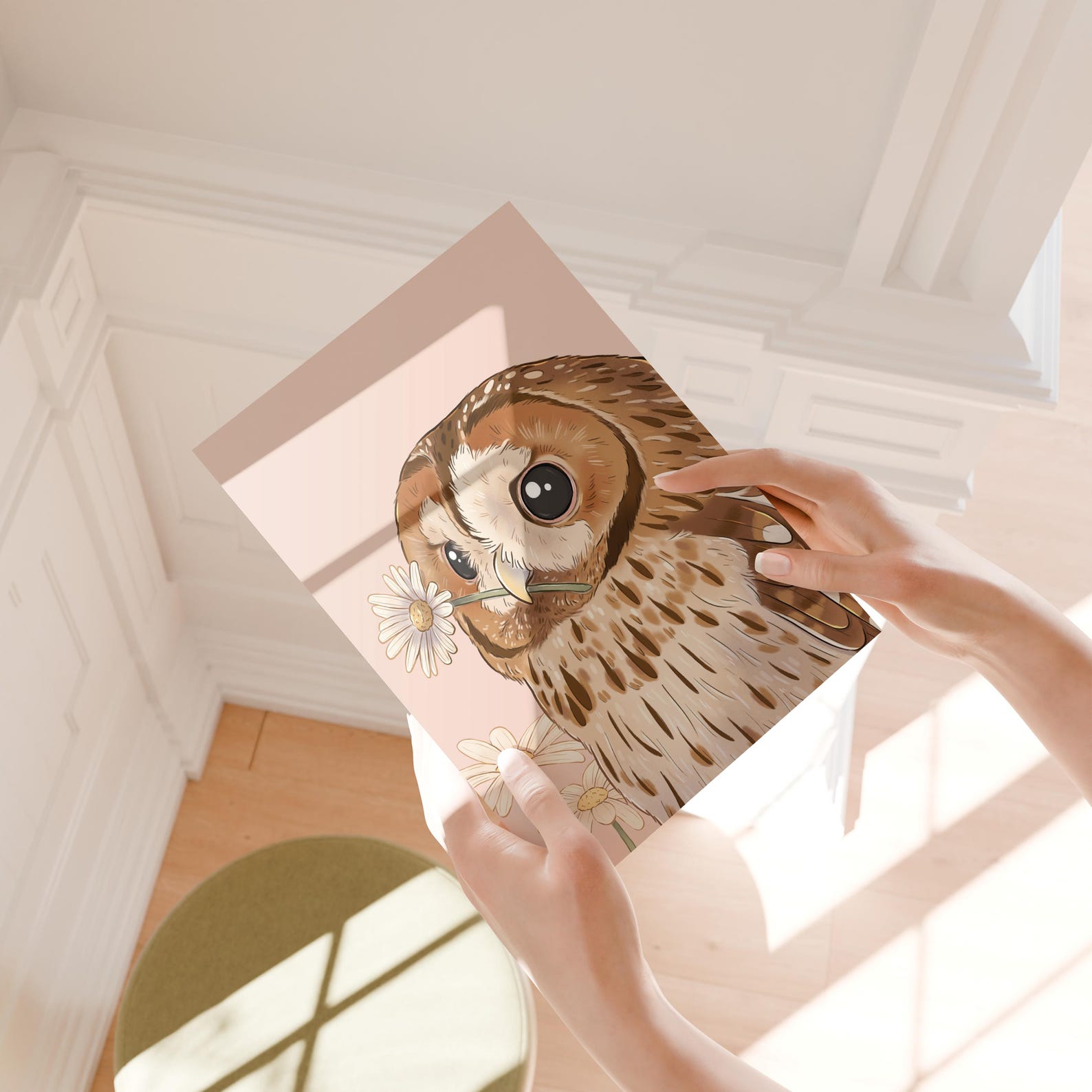 A gentle A4 art print featuring a tawny owl nestled among blooming daisies, perfect for nature lovers, woodland décor, and wildlife art collectors.