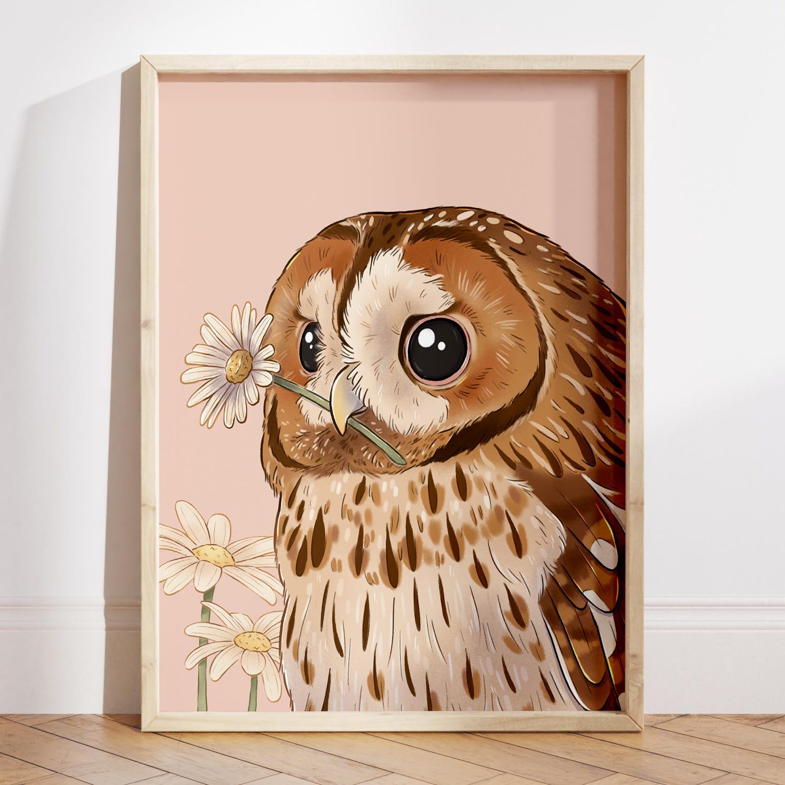 Bring a touch of quiet woodland magic into your home with this A4 fine art print featuring a softly illustrated tawny owl surrounded by cheerful daisies. Created by a UK wildlife illustrator (that’s me!), this piece blends rich textures, warm tones and a hint of whimsy, an ideal gift for bird lovers, gardeners, and woodland wanderers.