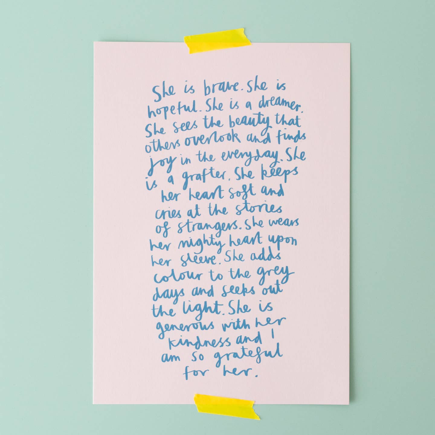 She is brave... a beautiful print featuring words that the artist wrote when thinking about all the amazing women in her life.