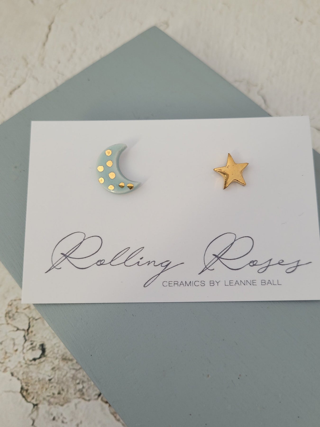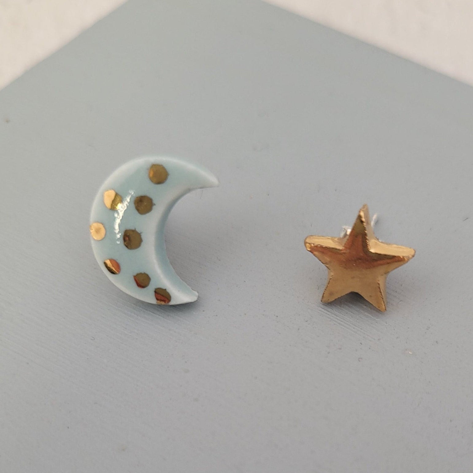 A pair of  porcelain studs with 22k gold lustre detail. Ear posts are silver plated hypoallergenic studs for pierced ears.