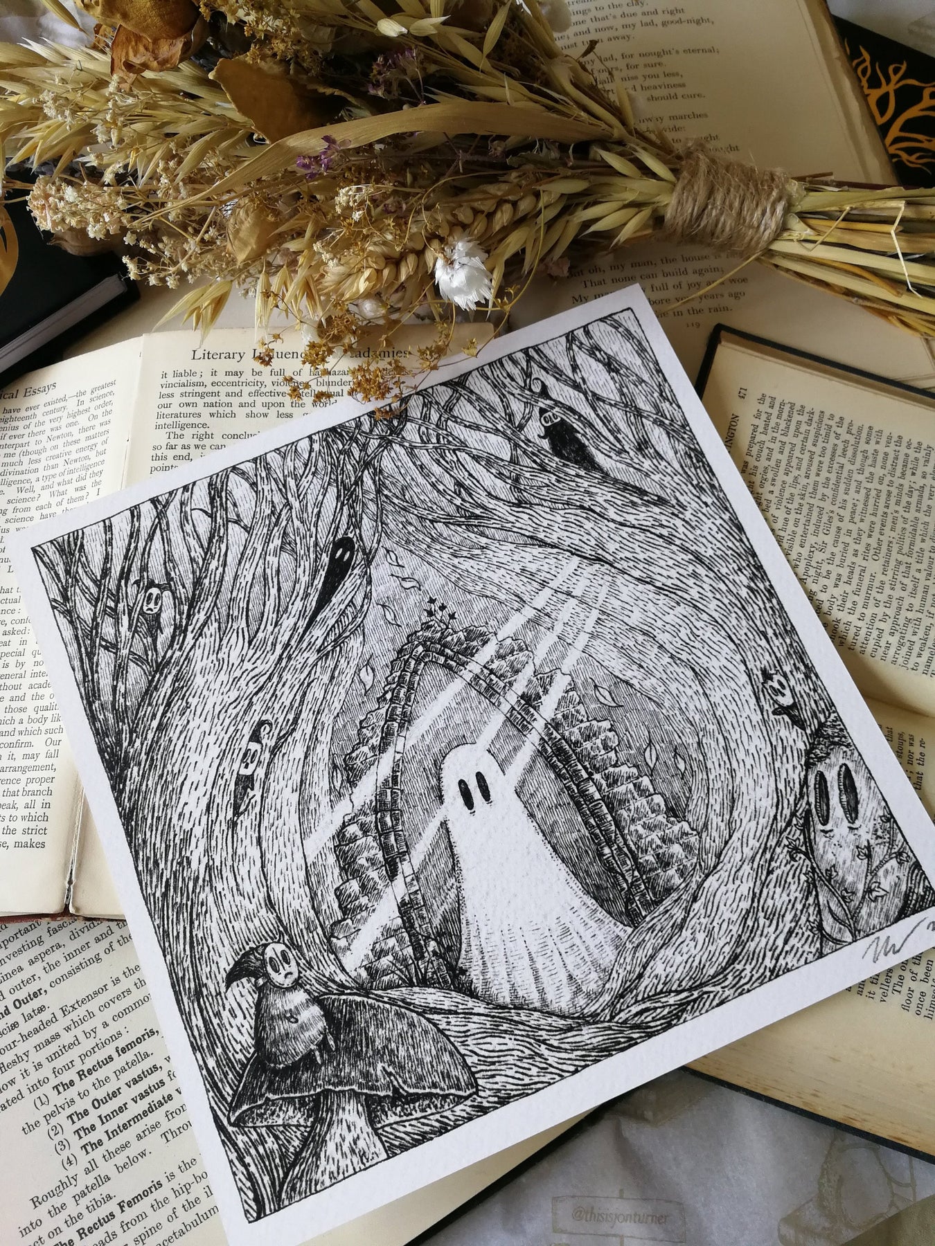 Square print, 20x20cm (roughly 8x8 inches), printed in black ink on premium textured Tintoretto Gesso 300gsm card.