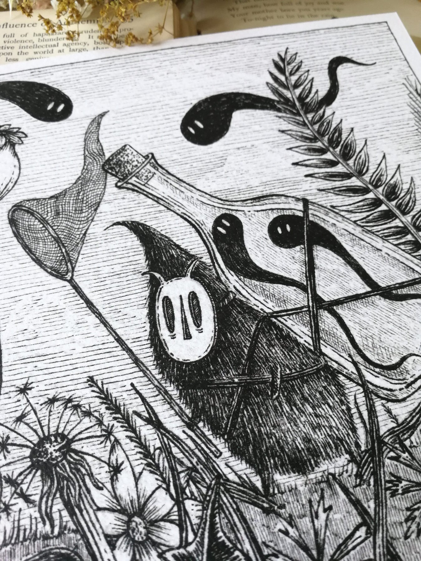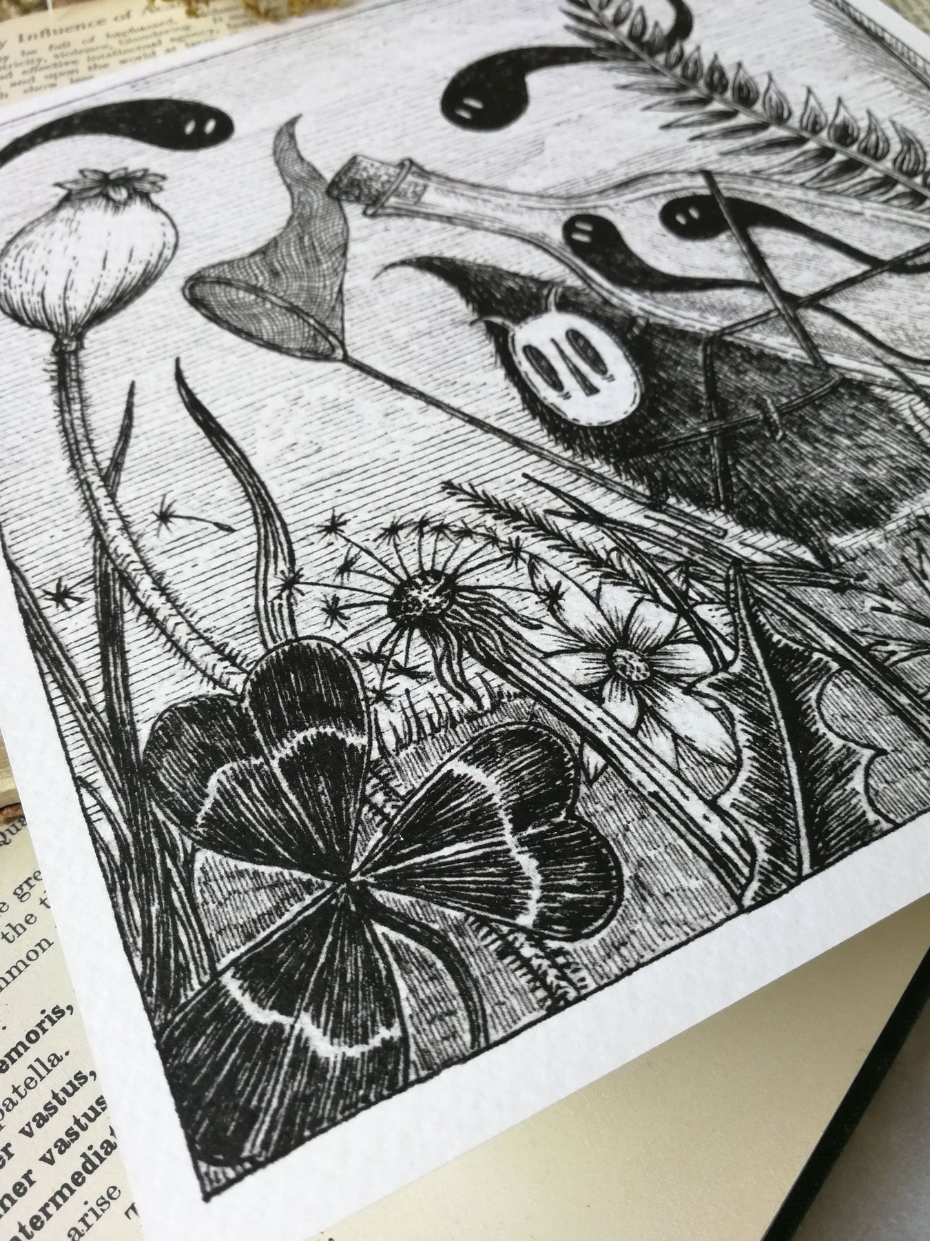 Square print, 20x20cm (roughly 8x8 inches), printed in black ink on premium textured Tintoretto Gesso 300gsm card.