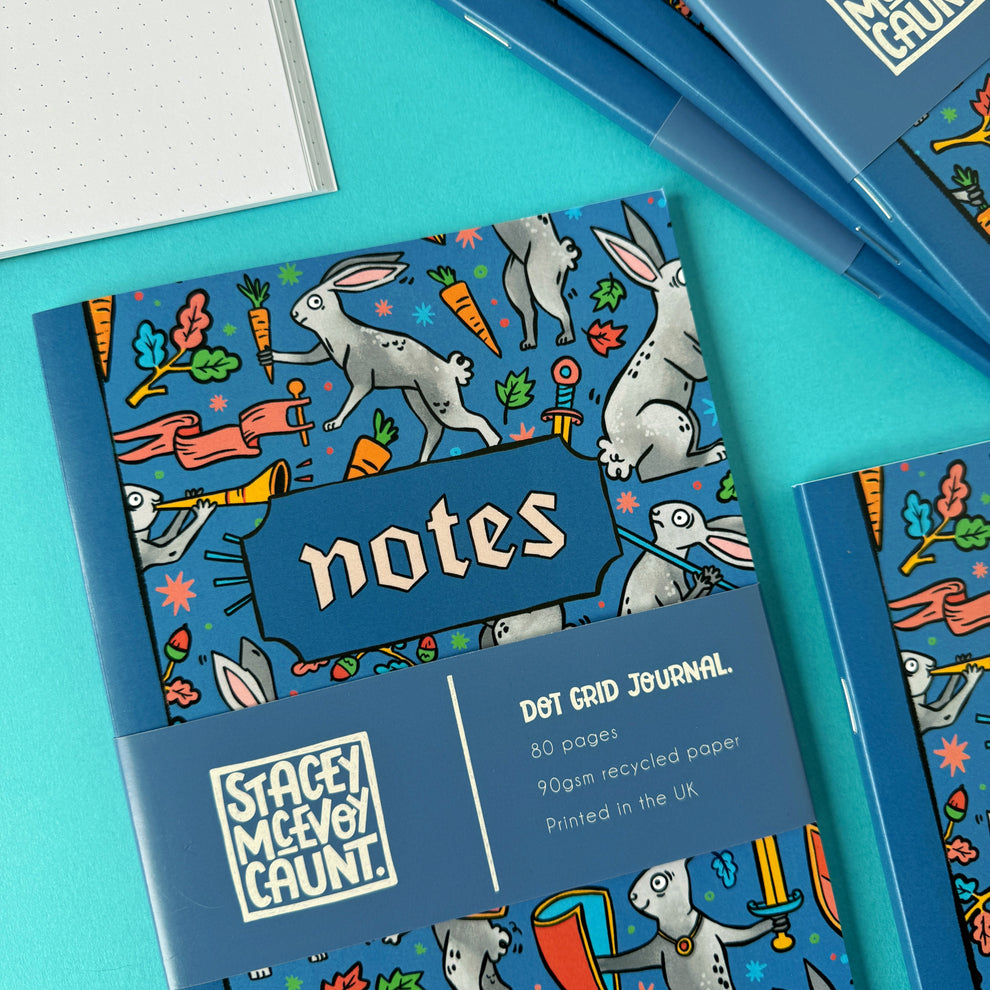 A nice and chunky notebook with A medieval dueling rabbit illustrations on the cover. Inspired by the weird and wonderful illustrations found in the margins of medieval manuscripts.