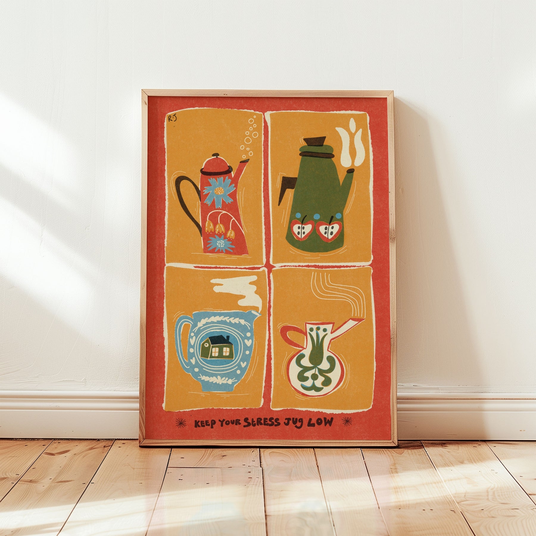 Featuring four brewing, steamy jugs in a riso-inspired design, this hand drawn print blends playful positivity with folk art vibes.