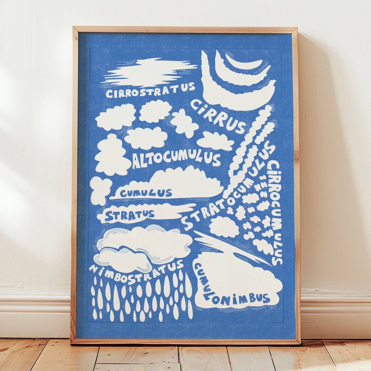 Let your mind drift with this dreamy Risograph inspired cloud print, featuring soft blue and white tones that capture the ever-changing sky.
