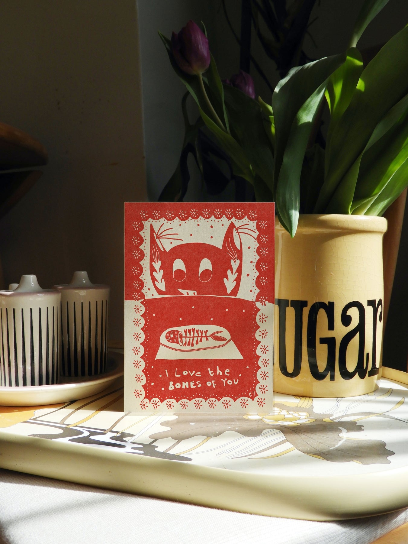 This red and white, vintage-inspired folky card showcases a funky cat illustration gazing at a fish bone alongside the phrase “I love the bones of you.” A humorous and romantic greeting card ideal for Valentine’s Day, anniversaries, or any cat lover.