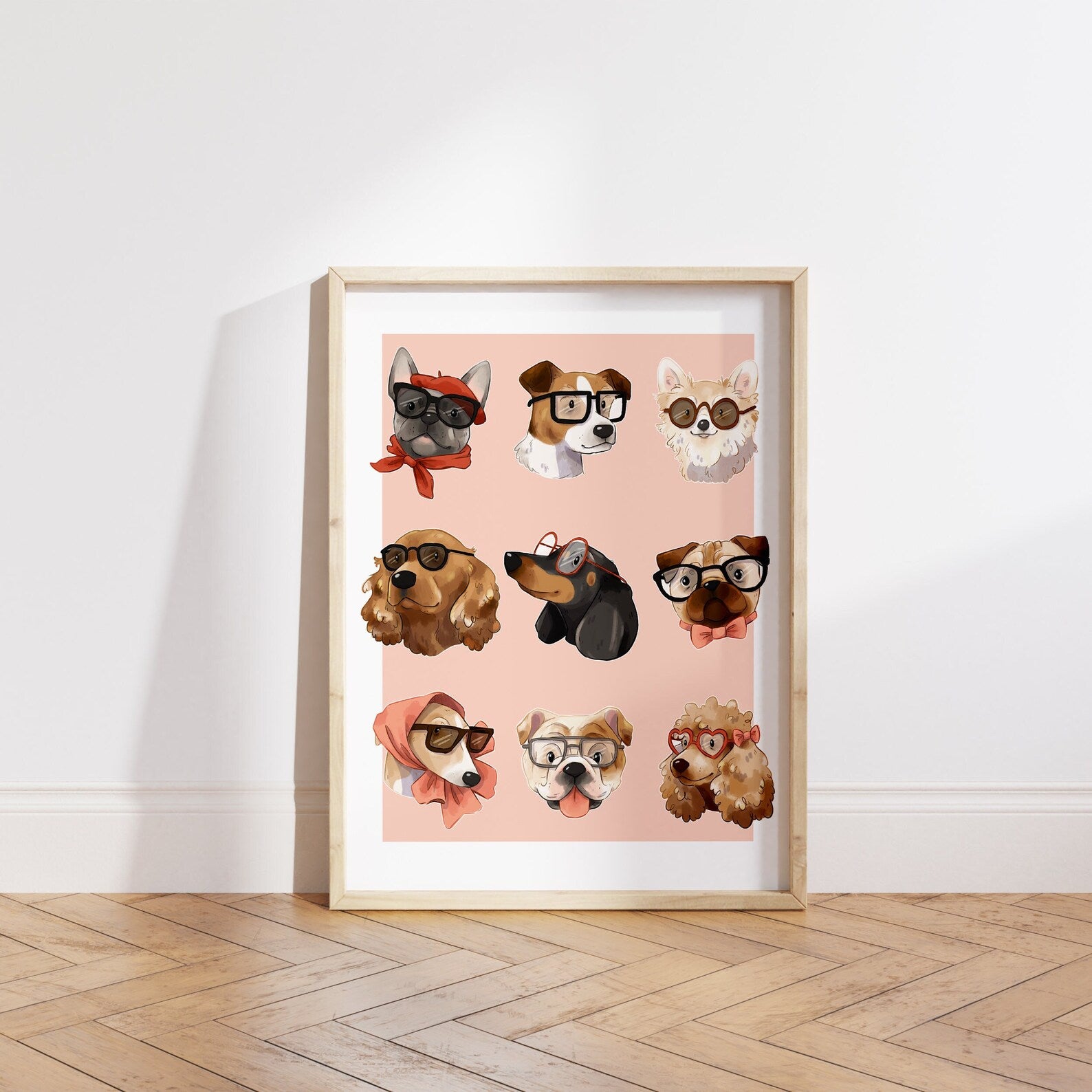 Brighten up your room with this digitally illustrated group of dogs in glasses illustrated art print. Dogs illustrated - french bulldog, jack russell terrier, chihuahua, golden retriever, dachshund, pug, greyhound, english bulldog and poodle.
