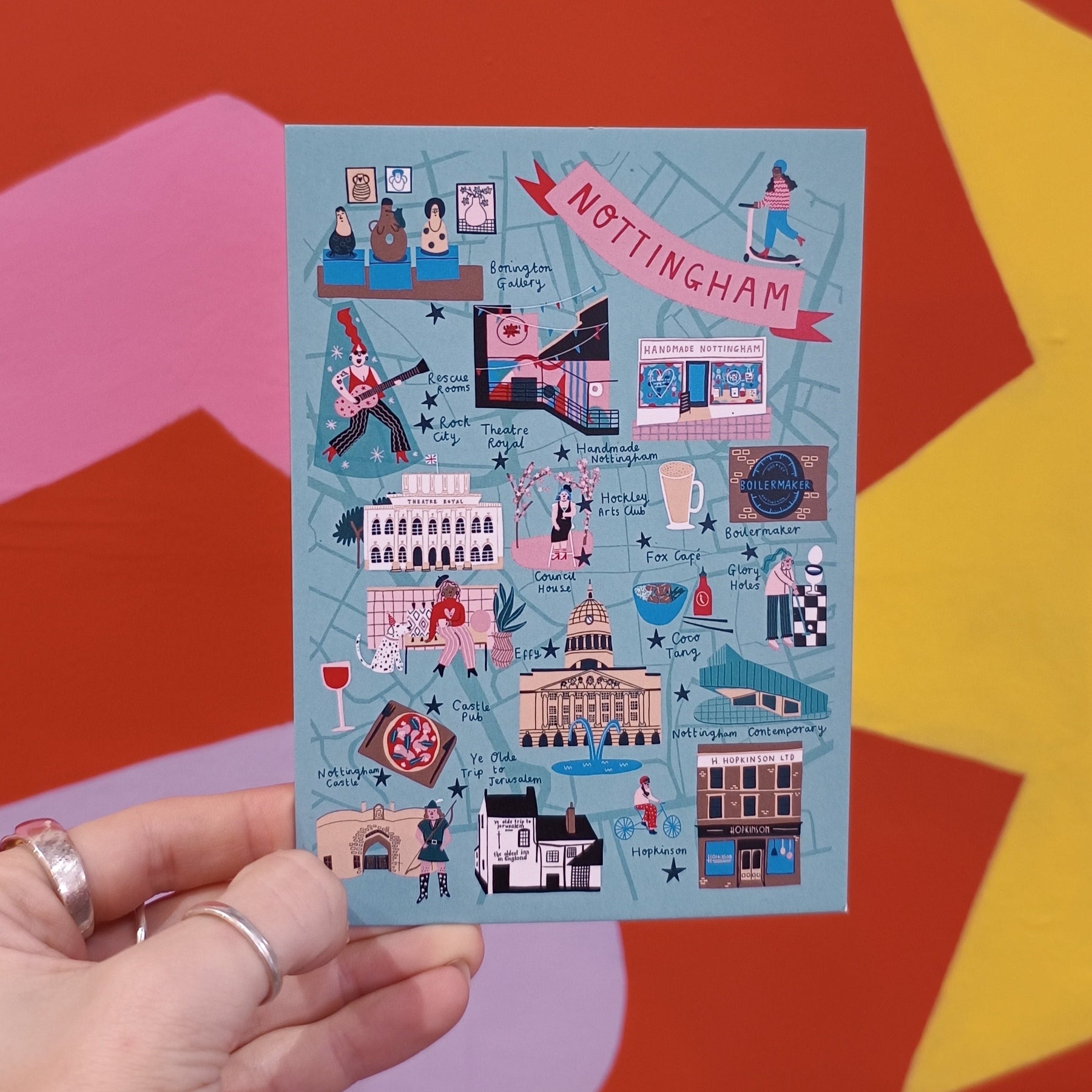 Illustrated map of Nottingham featuring landmark buildings, secret cocktail bars, music venues and plenty of indie food and drink hotspots.