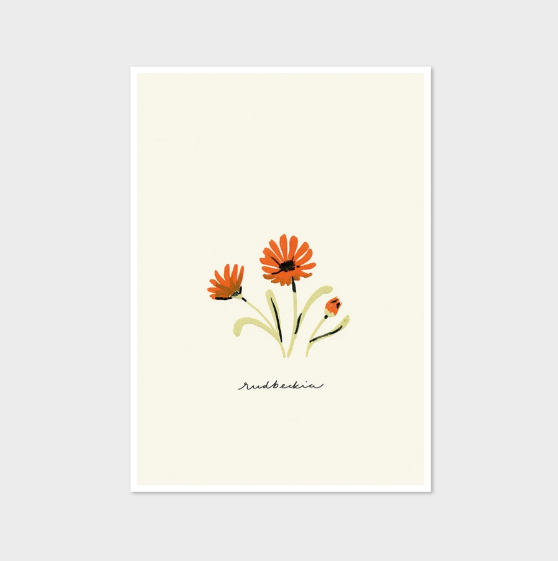 This lovely illustrated print features an Orange, daisy-style flower, the Rudbeckia. Starting off as a tiny “ditsy” floral illustration in my sketchbook, it was transformed into this pretty botanical print.
