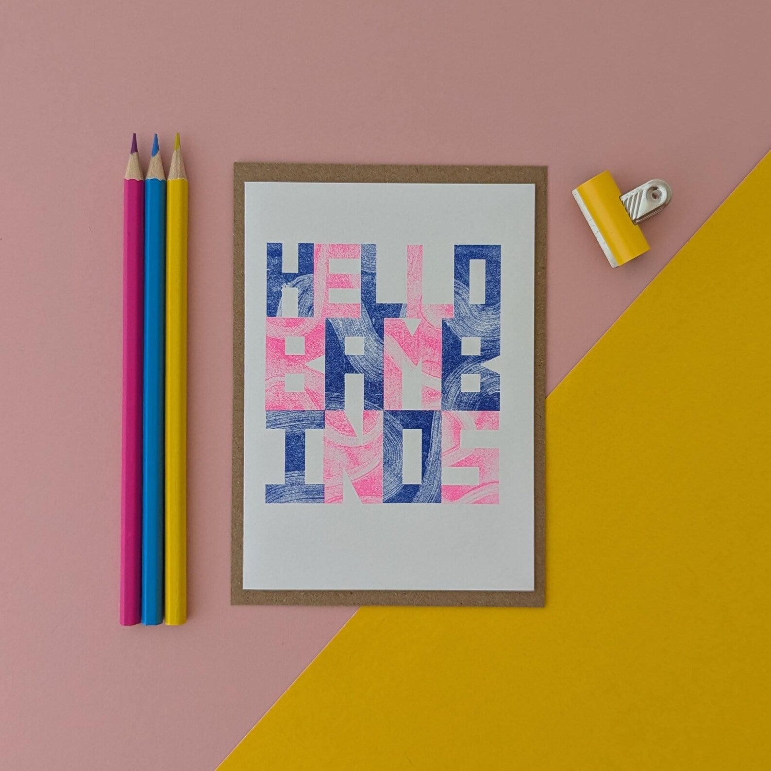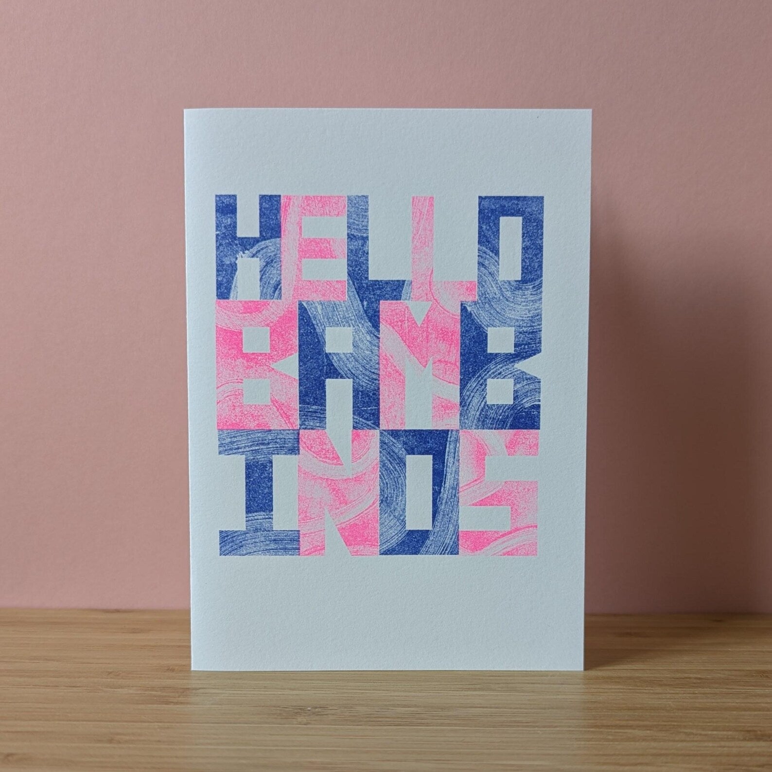This vibrant riso printed Hello Bambinos card features bold custom lettering and cool brush stroke textures.