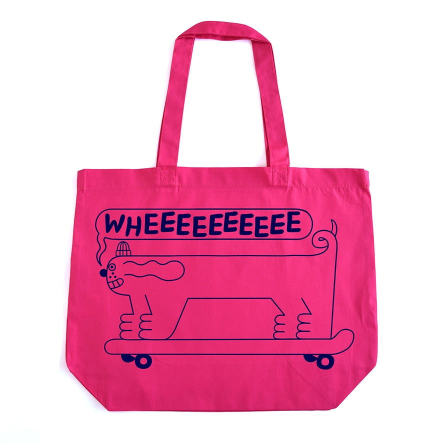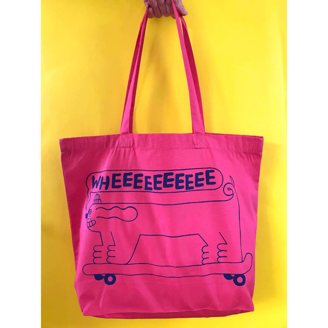 It's the LONGEST dog in the world having a great old time on it's long board. We bought these wide tote bags by accident (thought they were our regular portrait type ones oops) so LONG DOG was born! Wheee!