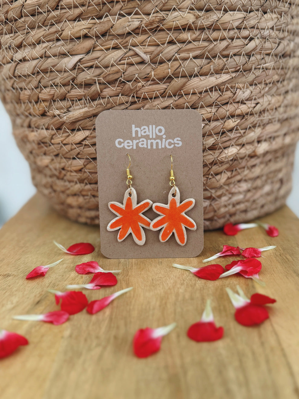 Handmade, Ceramic Flower shaped earrings. Each are hand cut and hand painted, making each pendant unique to the other. Available with Silver or Gold hooks.