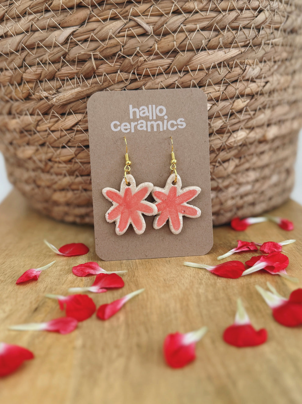 Handmade, Ceramic Flower shaped earrings. Each are hand cut and hand painted, making each pendant unique to the other. Available with Silver or Gold hooks.