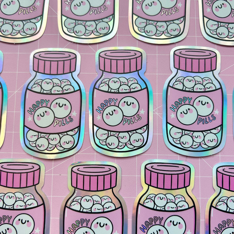 Need a mood boost? This Happy Pills Bottle with a glossy sticker will have you covered!