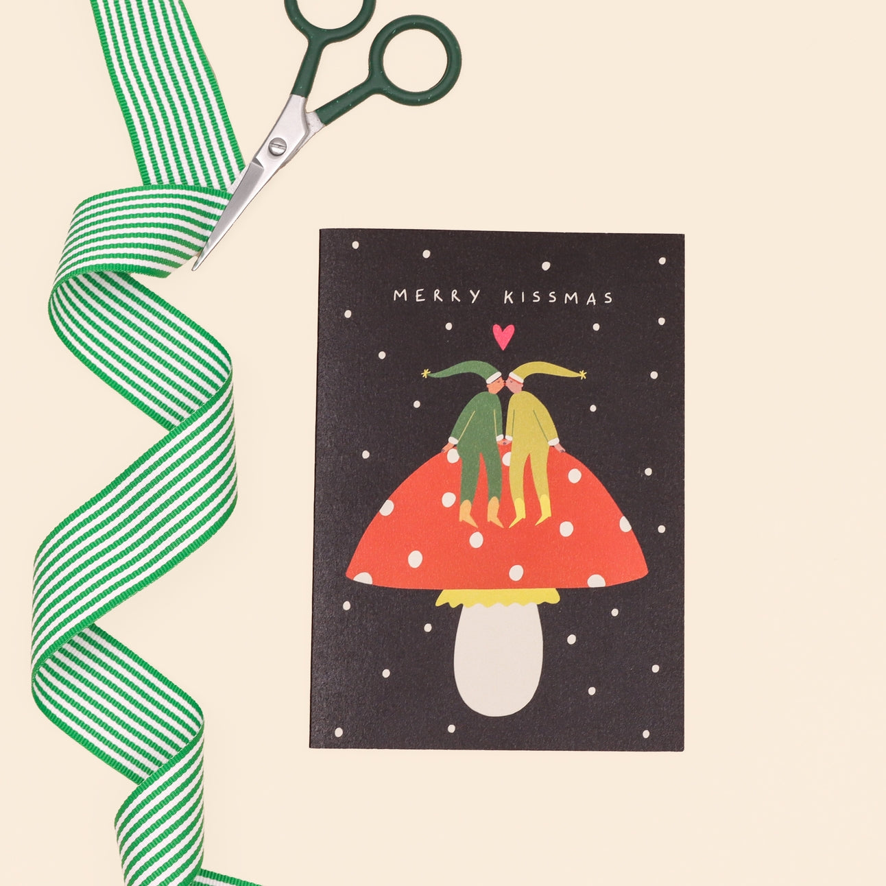 A sweet Christmas card featuring two festive elves having a kiss on top of a mushroom. Set against a snowy night background with a contemporary colour palette.