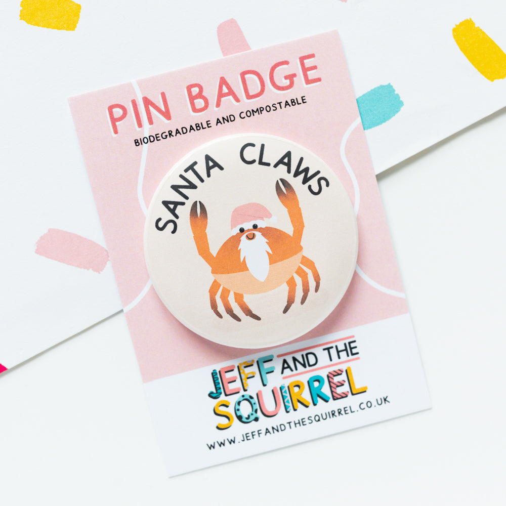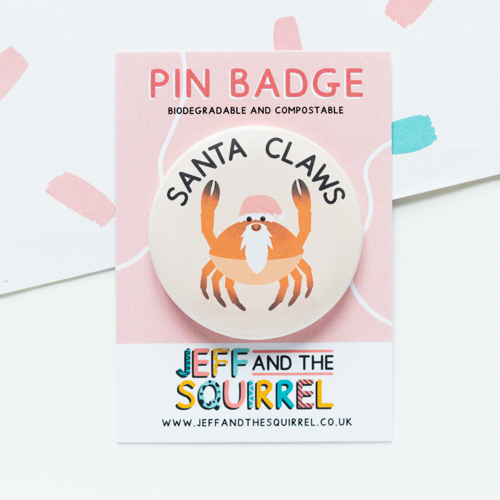 Get in the Christmas spirit with this 'Santa Claws' Christmas badge. This little crab is wearing a Santa hat and is ready for alll the festivities that come his way!
