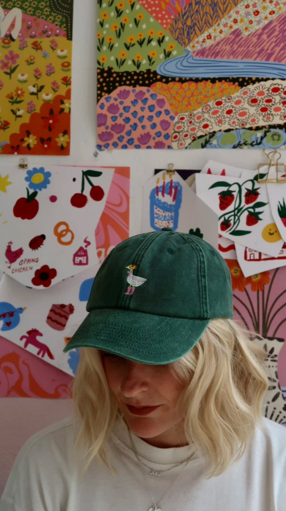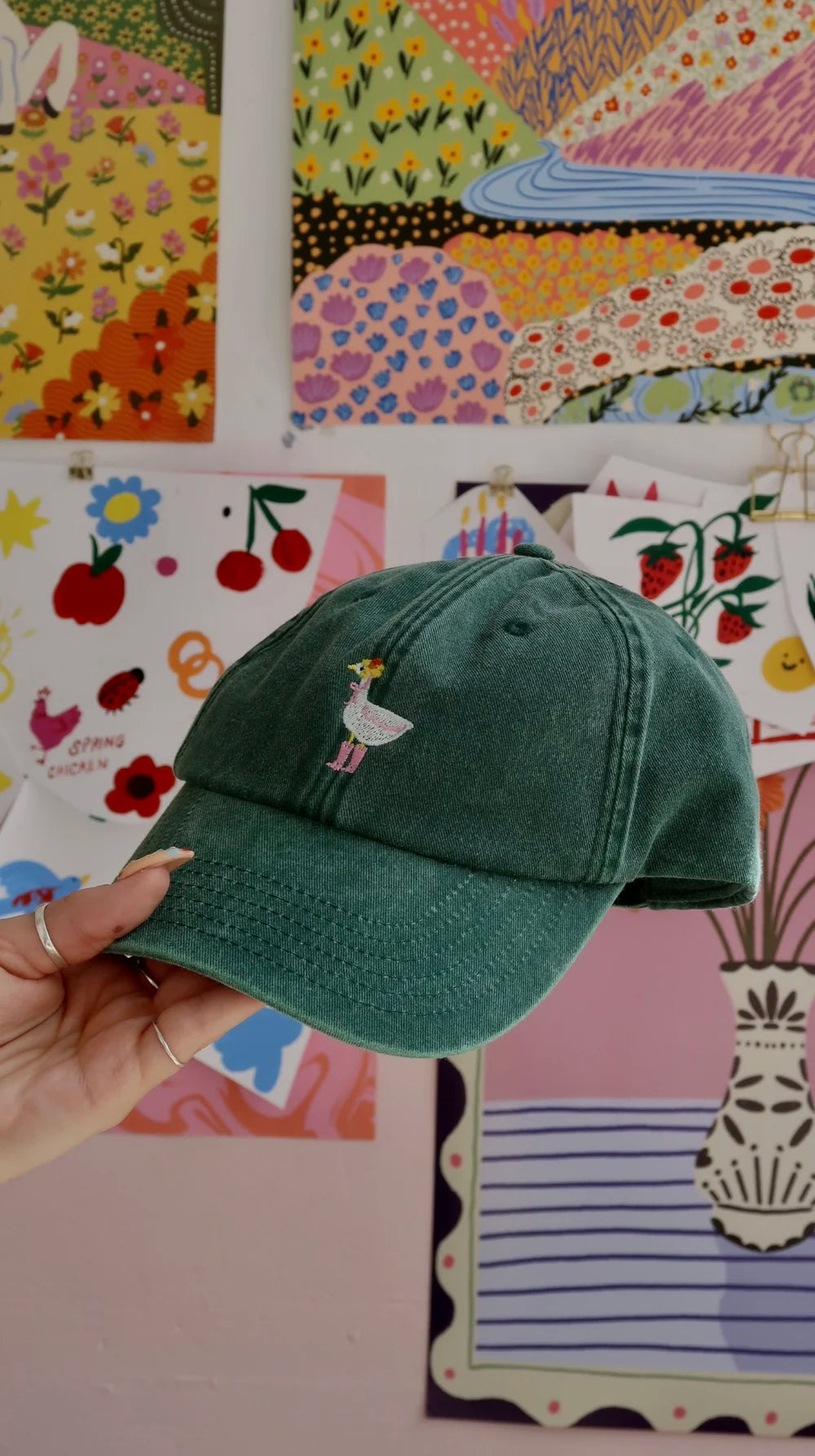 Vintage style washed green 6 panel Beechfield cap, made from 100% Cotton featuring our Silly Goose motif, embroidered in the UK. Perfect for all you silly gooses on the loose!