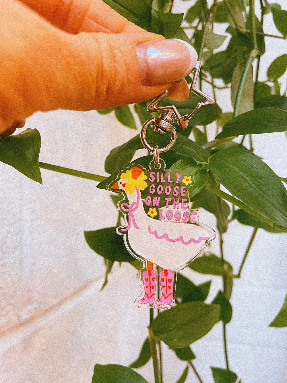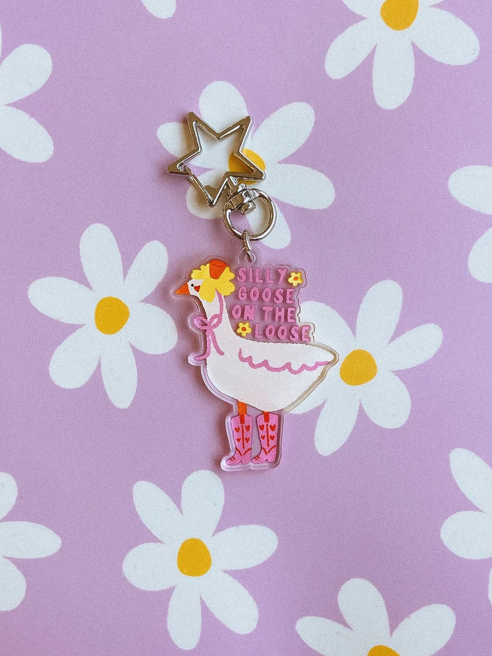 An acrylic keyring with the print on one side. Cute lhorse illustration with stars and a phrase that says, sass!