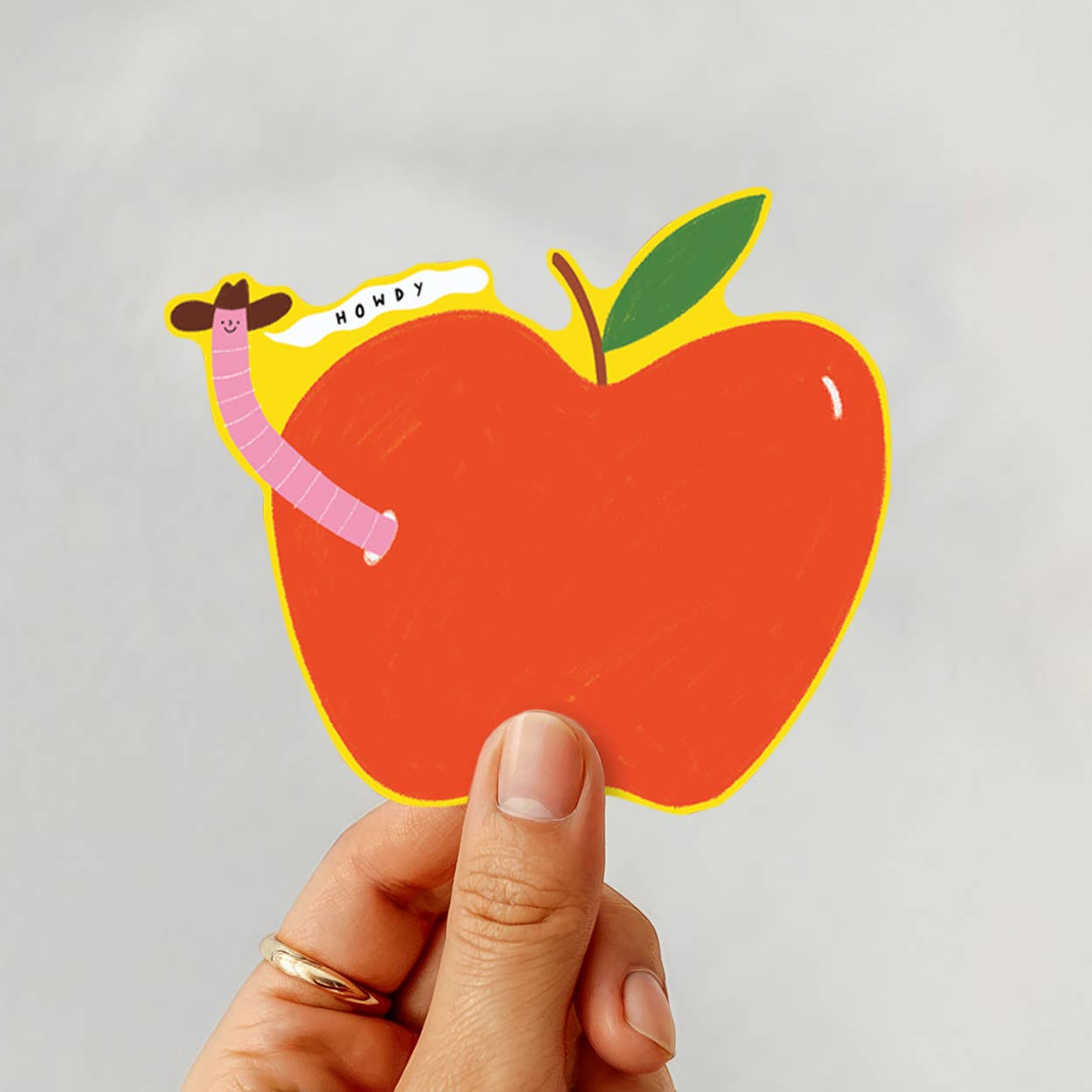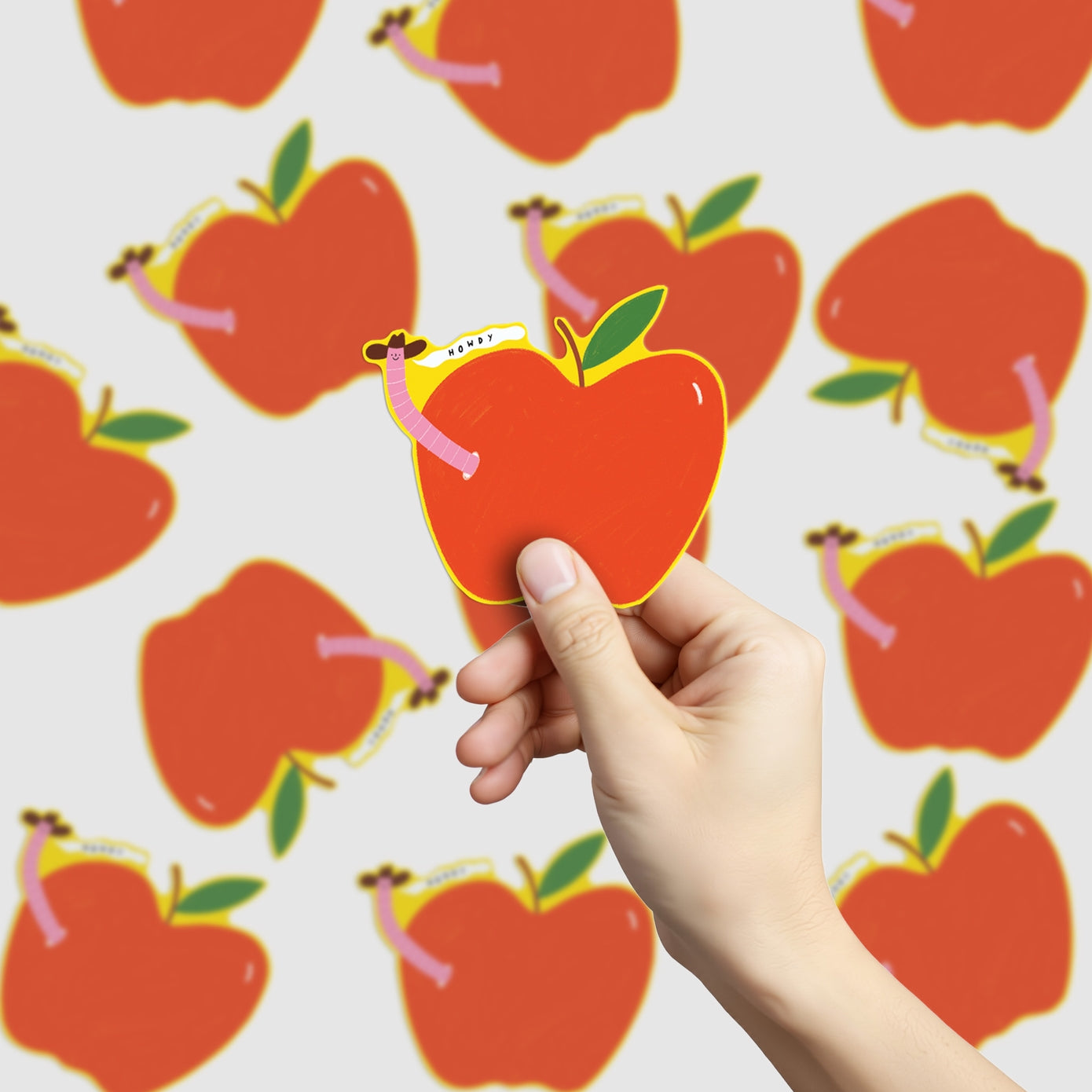Vinyl weatherproof sticker of a cute cowboy worm popping out of an apple saying 'howdy'
