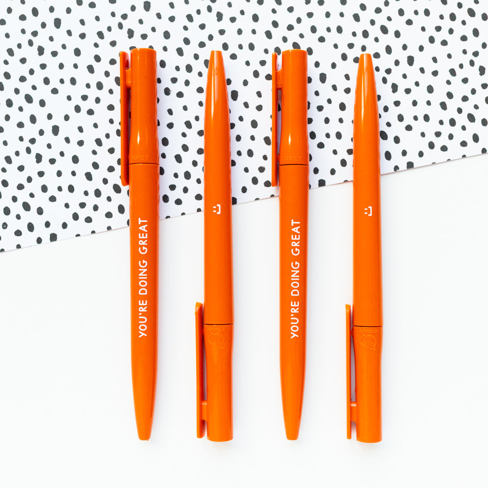 Say hello to our new orange pen! This recycled pen reads 'You're Doing Great' and features a little smiley face on the opposite side :)